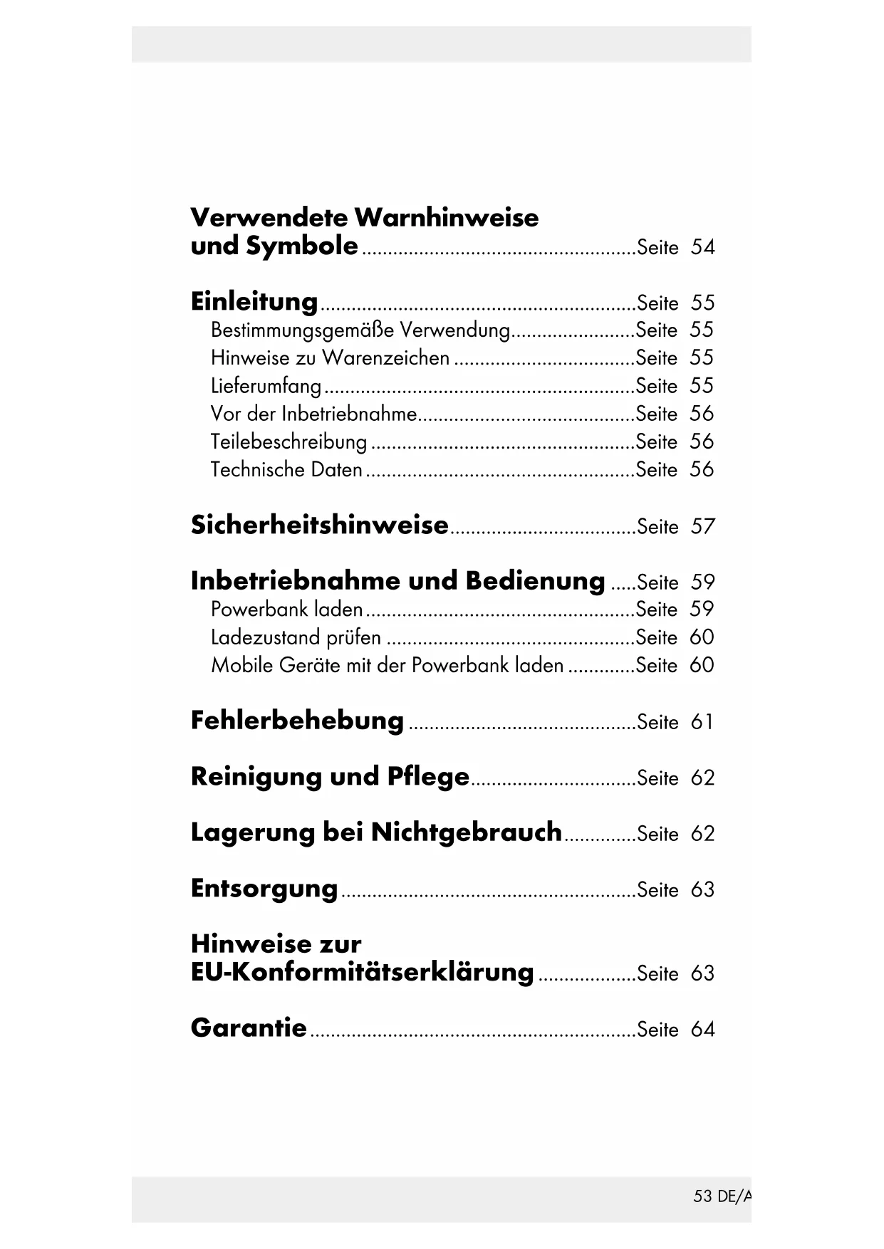 - Bei gleichzeitiger Nutzung aller Ausgänge darf die Gesamt- stromaufnahme der angeschlossenen Geräte 3 A nicht überschreiten. Sicherheitshinweise Machen Sie sich vor der ersten Benutzung des Produkts mit allen Bedien- und Sicherheitshinweisen vertraut. Händigen Sie alle Unterlagen bei Weitergabe des Produkts an Dritte mit aus. Kontrollieren Sie das Produkt vor der Verwendung auf äußere sichtbare Schäden. Nehmen Sie ein beschädigtes oder heruntergefallenes Produkt nicht in Betrieb. Dieses Produkt kann von Kindern ab 8 Jahren und darüber sowie von Personen mit verringerten physischen, sensori- schen oder mentalen Fähigkeiten oder Mangel an Erfahrung und Wissen benutzt werden, wenn Sie beaufsichtigt oder bezüglich des sicheren Gebrauchs des Produktes unter- wiesen wurden und die daraus resultierenden Gefahren verstehen. Kinder dürfen nicht mit dem Produkt spielen. Reinigung und Benutzer-Wartung dürfen nicht von Kindern ohne Beaufsichtigung durchgeführt werden. GEFAHR Verpackungsmaterialien sind kein Spielze ug. Halten Sie alle Verpackungsmaterialien von Kindern fern. Es besteht Erstickungsgefahr! Verwenden Sie das Produkt immer auf einer stabilen und ebenen Fläche. Bei Stürzen kann es beschädigt werden. Setzen Sie das Produkt nicht direktem Sonnenlicht oder hohen Temperaturen aus. Anderenfalls kann es überhitzen und irreparabel beschädigt werden. Betreiben Sie das Produkt nicht in der Nähe von Wärme- quellen wie Heizkörpern oder anderen wärmeerzeug enden Geräten.58 DE/AT/CH Das Produkt nicht in der Nähe von offenen Flammen betreiben. Das Produkt ist nicht für den Betrieb in Räumen mit hoher Temperatur oder Luftfeuchtigkeit (z. B. Badezimmer) oder übermäßigen Staubaufkommen ausgelegt. Achten Sie darauf, dass keine Fremdkörper in das Pro- duktinnere gelangen können. Setzen Sie das Produkt nie extremer Hitze aus. Dies gilt insbesondere für eine Lagerung im Auto. Bei längeren Standzeiten entstehen extreme Temperaturen in Innen- raum und Handschuhfach. Entfernen Sie elektrische und elektronische Geräte aus dem Fahrzeug. Verwenden Sie das Produkt nicht sofort, wenn es von einem kalten Raum in einen warmen Raum gebracht w urde. Lassen Sie das Produkt erst akklimatisieren, bevor Sie es einschalten. WARNUNG Öffnen Sie niemals das Gehäuse des Produktes. Es befinden sich keine zu wartenden Bauteile im Produkt. Nehmen Sie keine eigenmächtigen Veränderungen an dem Produkt vor. Lassen Sie Reparaturen am Produkt nur von autorisierten Fachbetrieben oder dem Kundenservice durchführen. Durch unsachgemäße Reparaturen können erhebliche Gefahren für den Benutzer entstehen. Zudem erlischt der Garantieanspruch. Setzen Sie das Produkt keinem Spritz- und / oder Tropf- wasser aus und stellen Sie keine mit Flüssigkeit gefüllten Gegenstände wie Vasen oder offene Getränke auf oder neben das Produkt. Schalten Sie das Produkt unver züglich aus und ziehen Sie das möglicherweise angeschlossene Ladekabel vom Produkt ab, falls Sie Brandgeruch oder Rauchentwicklung feststellen. Lassen Sie das Produkt durch einen qualifiz ierten Fachmann überprüfen, bevor Sie es erneut verwenden. Bei Verwendung eines USB-Netzteils muss die verwendete Steckdose immer leicht zugänglich sein, damit in einer Gefahrensituation das USB-Netzteil schnell aus der59 DE/AT/CH Steckdose entfernt werden kann. Beachten Sie dazu die Bedienungsanleitung des Herstellers. WARNUNG Eine falsche Handhabung von Lithium- Polymer Akkus kann zu Feuer, Explosionen, Auslaufen gefährlicher Stoffe oder anderen Gefahrensituationen führen! Werfen Sie das Produkt nicht ins Feuer, da der integrierte Akku explodieren kann. Beachten Sie die Nutzungseinschränkungen bzw. Nut- zungsverbote für batteriebetriebene Produkte an Orten mit gesonderter Gefahrenlage, wie z. B. Tankanlagen, Flugzeugen, Krankenhäusern, usw. WARNUNG Decken Sie das Produkt nicht während des Ladevorgangs ab. Andernfalls kann das Produkt überhitzen. Inbetriebnahme und Bedienung Powerbank laden Verwenden Sie wegen der hohen Stromaufnahme der Powerbank niemals einen Notebook- oder PC-USB-An- schluss zum Laden der Powerbank. Verwenden Sie zum Aufladen der Powerbank ausschließ- lich ein geeignetes USB-Netzteil (5 V , min. 3 A; nicht mitgeliefert). Vor der Nutzung des Produkts muss der integrierte Akku vollständig geladen werden. Verwenden Sie zum Laden der Powerbank
