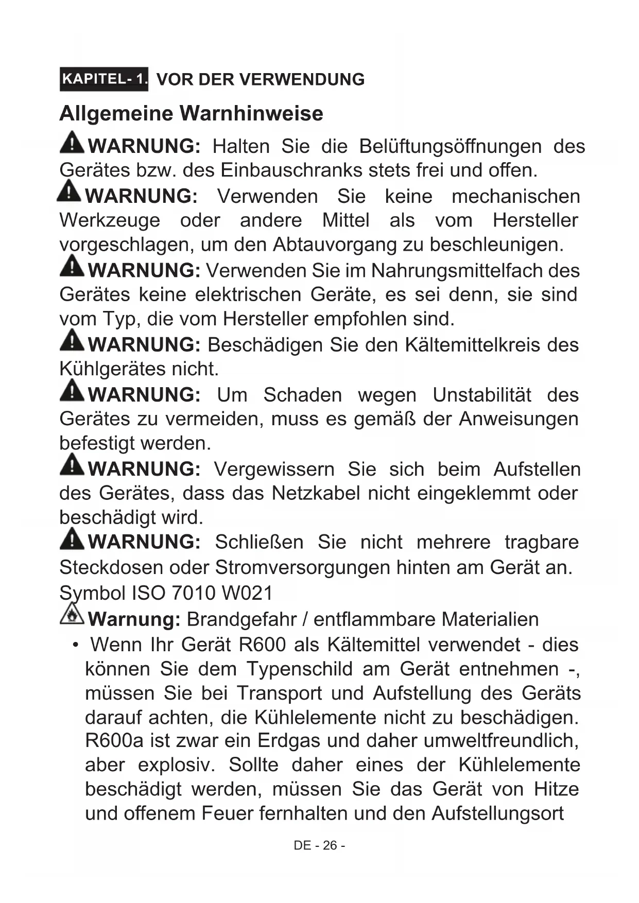 KAPITEL- 1. Allgemeine Warnhinweise WARNUNG: Halten Sie die Belüftungsönungen des Gerätes bzw. des Einbauschranks stets frei und oen. WARNUNG: Verwenden Sie keine mechanischen Werkzeuge oder andere Mittel als vom Hersteller vorgeschlagen, um den Abtauvorgang zu beschleunigen. WARNUNG: Verwenden Sie im Nahrungsmittelfach des Gerätes keine elektrischen Geräte, es sei denn, sie sind vom Typ, die vom Hersteller empfohlen sind. WARNUNG: Beschädigen Sie den Kältemittelkreis des Kühlgerätes nicht. WARNUNG: Um Schaden wegen Unstabilität des Gerätes zu vermeiden, muss es gemäß der Anweisungen befestigt werden. WARNUNG: Vergewissern Sie sich beim Aufstellen des Gerätes, dass das Netzkabel nicht eingeklemmt oder beschädigt wird. WARNUNG: Schließen Sie nicht mehrere tragbare Steckdosen oder Stromversorgungen hinten am Gerät an. Symbol ISO 7010 W021 Warnung: Brandgefahr / entammbare Materialien