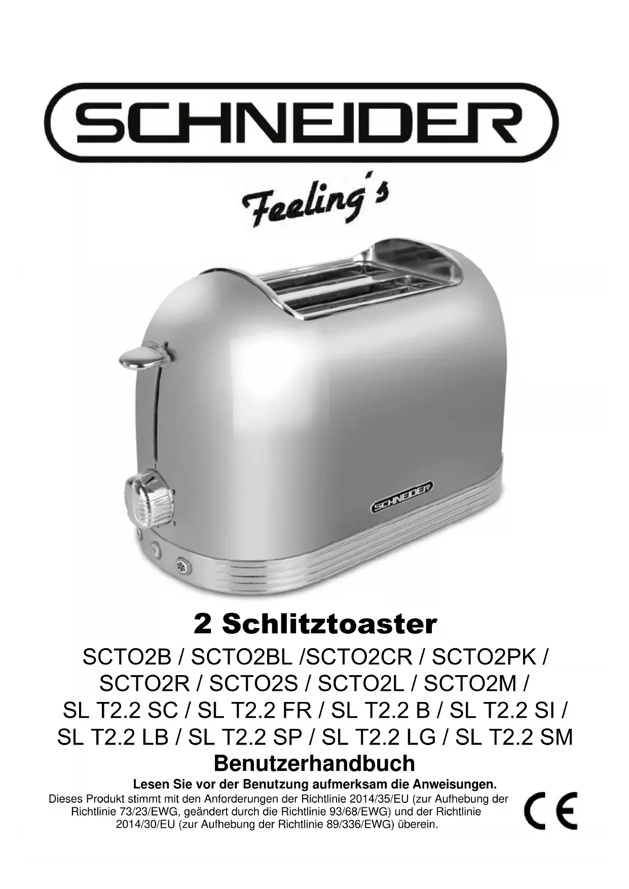 The internal components of your appliance are fragile, never touch them with any object. TECHNICAL SPECIFICATIONS Voltage:220-240V~ Frequency: 50-60Hz Power: 685-815W The warranty does not cover the wear parts of the product, nor the problems or damage resulting from: (1) surface deterioration due to normal wear and tear of the product; (2) defects or deterioration due to contact with liquids and corrosion caused by rust; (3) any incident, abuse, misuse, alteration, disassembly or Unauthorized repair; (4) improper maintenance, improper use concerning the product or connection to an incorrect voltage; (5) any use of accessories not supplied or not approved by the manufacturer. The guarantee will be cancelled if the nameplate and / or serial number of the product are removed.In France, this product is imported by: ADMEA- 12 rue Jules Ferry - 93110 Rosny Sous Bois In Germany, this product is imported by: PKM GmbH & Co.KG Neuer Wall 2-6, D-47441 Moers2 Schlitztoaster SCTO2B / SCTO2BL /SCTO2CR / SCTO2PK / SCTO2R / SCTO2S / SCTO2L / SCTO2M / SL T2.2 SC / SL T2.2 FR / SL T2.2 B / SL T2.2 SI / SL T2.2 LB / SL T2.2 SP / SL T2.2 LG / SL T2.2 SM Benutzerhandbuch Lesen Sie vor der Benut zung aufmerksam die Anweisungen. Dieses Produkt stimmt mit den Anforderungen der Richtlinie 2014/35/EU (zur Aufhebung der Richtlinie 73/23/EWG, geändert durch die Richtlinie 93/68/EWG) und der Richtlinie 2014/30/EU (zur Aufhebung der Richtlinie 89/336/EWG) überein.DE - 2 WICHTIGE SICHERHEITSHINWEISE Tauchen Sie das Gerät niemals in Flüssigkeiten. Durch Risse und Öffnungen eindringendes Wasser könnte das Gerät beschädigen. Achten Sie darauf, dass die Scheiben mühelos in die Schlitze passen, bevor Sie sie toasten. Gebrochene oder zu dicke Scheiben können den Mechanismus schädigen. Berühren Sie im Betrieb keine Metallteile. Berühren Sie heiße Flächen nicht ohne Handschuhe oder anderen Schutz. Lassen Sie das Gerät nicht unbeaufsichtigt oder innerhalb der Reichweite von Kindern arbeiten. Dieses Gerät sollte ausschließlich von Erwachsenen benutzt werden.DE - 3
