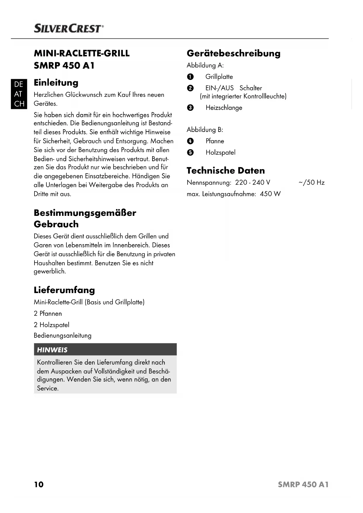 MINI-RACLETTE-GRILL SMRP 450 A1 Einleitung Herzlichen Glückwunsch zum Kauf Ihres neuen Gerätes. Sie haben sich damit für ein hochwertiges Produkt entschieden. Die Bedienungsanleitung ist Bestand- teil dieses Produkts. Sie enthält wichtige Hinweise für Sicherheit, Gebrauch und Entsorgung. Machen Sie sich vor der Benutzung des Produkts mit allen Bedien- und Sicherheitshinweisen vertraut. Benut- zen Sie das Produkt nur wie beschrieben und für die angegebenen Einsatzbereiche. Händigen Sie alle Unterlagen bei Weitergabe des Produkts an Dritte mit aus. Bestimmungsgemäßer Gebrauch Dieses Gerät dient ausschließlich dem Grillen und Garen von Lebensmitteln im Innenbereich. Dieses Gerät ist ausschließlich für die Benutzung in privaten Haushalten bestimmt. Benutzen Sie es nicht gewerblich. Lieferumfang Mini-Raclette-Grill (Basis und Grillplatte) 2 Pfannen 2 Holzspatel Bedienungsanleitung HINWEIS Kontrollieren Sie den Lieferumfang direkt nach dem Auspacken auf V ollständigkeit und Beschä- digungen. Wenden Sie sich, wenn nötig, an den Service. Gerätebeschreibung Abbildung A: 1 Grillplatte 2 EIN-/AUS Schalter (mit integrierter Kontrollleuchte) 3 Heizschlange Abbildung B: 4 Pfanne 5 Holzspatel Technische Daten Nennspannung: 220 - 240 V