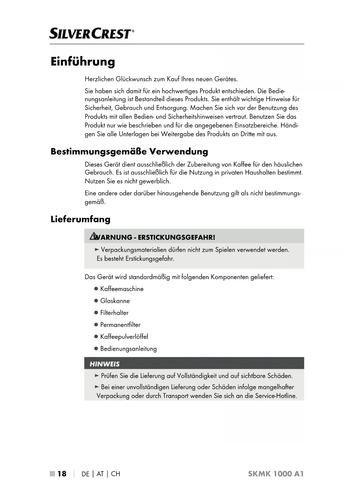 SKMK 1000 A1 Einführung Herzlichen Glückwunsch zum Kauf Ihres neuen Gerätes. Sie haben sich damit für ein hochwertiges Produkt entschieden. Die Bedie- nungsanleitung ist Bestandteil dieses Produkts. Sie enthält wichtige Hinweise für Sicherheit, Gebrauch und Entsorgung. Machen Sie sich vor der Benutzung des Produkts mit allen Bedien- und Sicherheitshinweisen vertraut. Benutzen Sie das Produkt nur wie beschrieben und für die angegebenen Einsatzbereiche. Händi- gen Sie alle Unterlagen bei Weitergabe des Produkts an Dritte mit aus. Bestimmungsgemäße Verwendung Dieses Gerät dient ausschließlich der Zubereitung von Kaffee für den häuslichen Gebrauch. Es ist ausschließlich für die Nutzung in privaten Haushalten bestimmt. Nutzen Sie es nicht gewerblich. Eine andere oder darüber hinausgehende Benutzung gilt als nicht bestimmungs- gemäß. Lieferumfang WARNUNG - ERSTICKUNGSGEFAHR! ► Verpackungsmaterialien dürfen nicht zum Spielen verwendet werden. Es besteht Erstickungsgefahr. Das Gerät wird standardmäßig mit folgenden Komponenten geliefert: ▯ Kaffeemaschine ▯ Glaskanne ▯ Filterhalter ▯ Permanentfilter ▯ Kaffeepulverlöffel ▯ Bedienungsanleitung HINWEIS ► Prüfen Sie die Lieferung auf Vollständigkeit und auf sichtbare Schäden. ► Bei einer unvollständigen Lieferung oder Schäden infolge mangelhafter Verpackung oder durch Transport wenden Sie sich an die Service-Hotline.DE