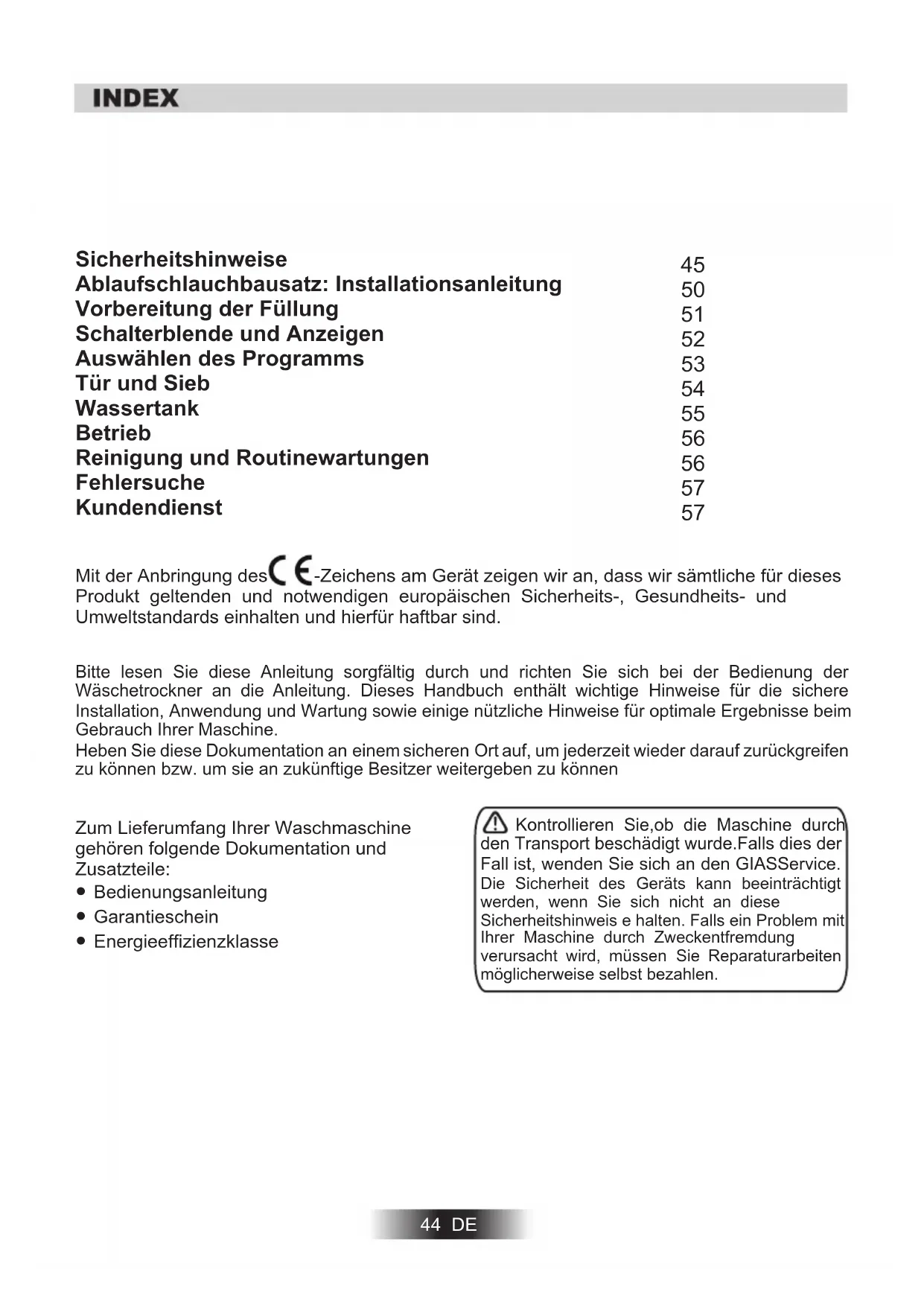 Kontrollieren Sie,ob die Maschine durch den Transport beschädigt wurde.Falls dies der Fall ist, wenden Sie sich an den GIASService. Die Sicherheit des Gerats kann beeinträchtigt werden, wenn Sie sich nicht an diese Sicherheitshinweis e halten. Falls ein Problem mit Ihrer Maschine durch Zweckentfremdung verursacht wird, mussen Sie Reparaturarbeitem möglichereise selbst bezahlen.