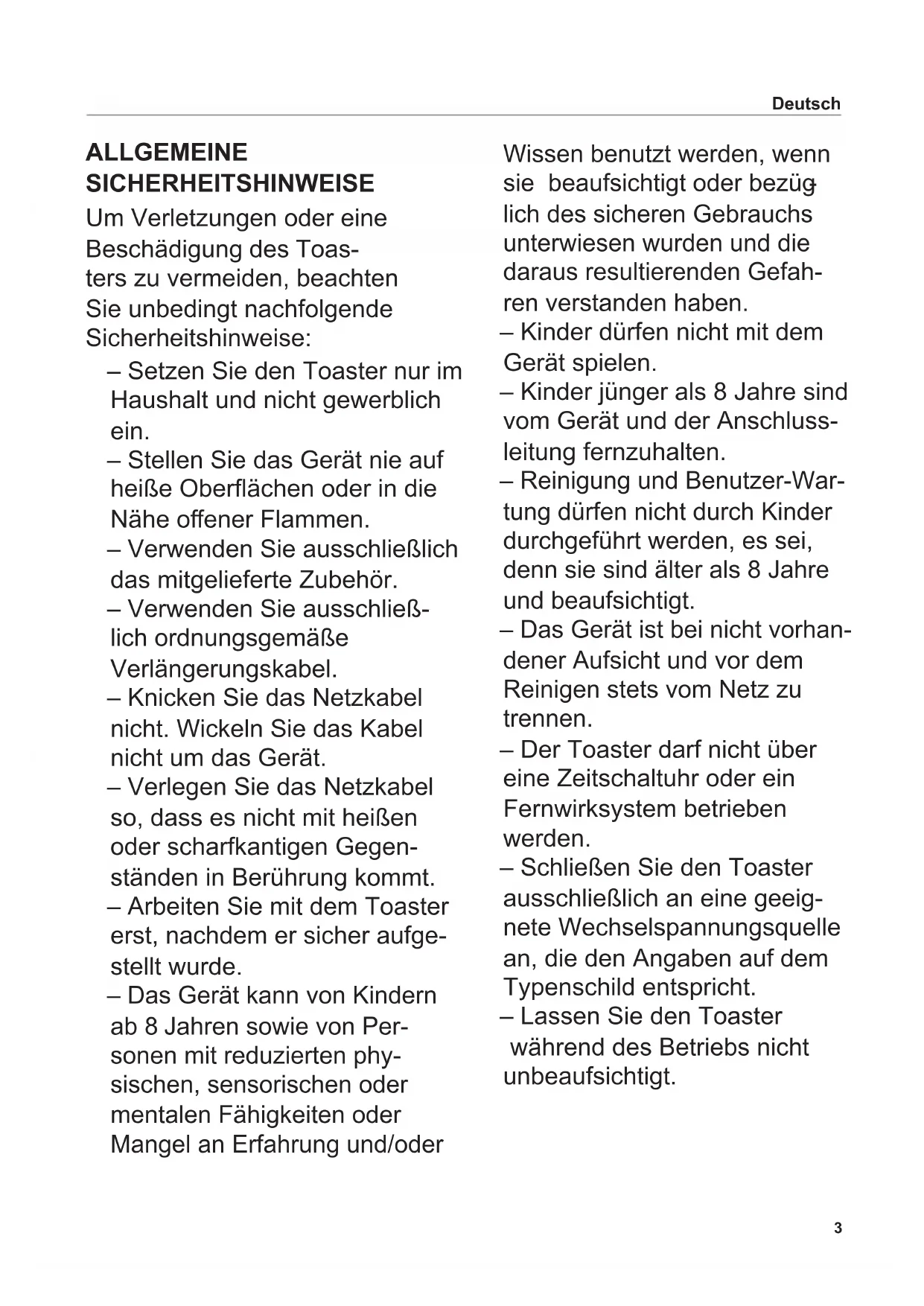 Kullanım kılavuzu .................................................................1143 ALLGEMEINE SICHERHEITSHINWEISE Um Verletzungen oder eine Beschädigung des Toas- ters zu vermeiden, beachten Sie unbedingt nachfolgende Sicherheitshinweise: – Setzen Sie den Toaster nur im Haushalt und nicht gewerblich ein. – Stellen Sie das Gerät nie auf heiße Oberächen oder in die Nähe oener Flammen. – Verwenden Sie ausschließlich das mitgelieferte Zubehör. – Verwenden Sie ausschließ- lich ordnungsgemäße Verlängerungskabel. – Knicken Sie das Netzkabel nicht. Wickeln Sie das Kabel nicht um das Gerät. – Verlegen Sie das Netzkabel so, dass es nicht mit heißen oder scharfkantigen Gegen- ständen in Berührung kommt. – Arbeiten Sie mit dem Toaster erst, nachdem er sicher aufge- stellt wurde. – Das Gerät kann von Kindern ab 8 Jahren sowie von Per- sonen mit reduzierten phy- sischen, sensorischen oder mentalen Fähigkeiten oder Mangel an Erfahrung und/oder Wissen benutzt werden, wenn sie beaufsichtigt oder bezüg