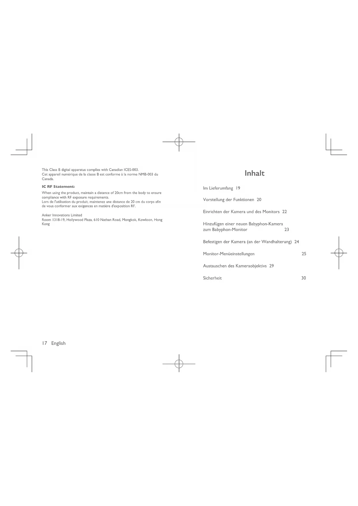 Zeigt die Kamera, deren Bild derzeit auf dem Babyphon-Monitor zu sehen ist. Hinweis: Dieses Symbol wird nicht auf dem Bildschirm angezeigt, wenn nur eine Kamera an den Monitor angeschlossen ist. „Kameras umschalten“ aktiviert Warnton aktiviert Geräuschpegel des Zimmers, in dem sich die Kamera bendet 08: 30 AM Aktuelle Uhrzeit Aktueller Akkustand des Babyphon-Monitors29 Eeutsch Deutsch 30 AUSTAUSCHEN DES KAMERAOBJEKTIVS Objektivtyp Verwendung Objektiv Standard- Kameraobjektiv (Standardobjektiv) Dieses Objektiv wird für die allgemeine Betrachtung empfohlen; Säuglinge sind innerhalb einer Reichweiter von 2 bis 3 Metern klar erkennbar. Beim Standard- Kameraobjektiv beträgt der Objektivwinkel 60°. Weitwinkelobjektiv Dieses Objektiv bietet eine Weitwinkelansicht des Zimmers. Der Objektivwinkel des Weitwinkelobjektivs beträgt 110°. Back Front Das Standard-Kameraobjektiv kann nicht entfernt werden. Wenn Sie das Weitwinkelobjektiv verwenden möchten, setzen Sie es einfach auf das Standard-Kameraobjektiv und befestigen es. SICHERHEIT Dieses Produkt entspricht den EU-Bestimmungen zur Störfestigkeit.VORSICHT: EXPLOSIONSGEFAHR, WENN DIE BATTERIE DURCH EINEN FALSCHEN BATTERIETYP ERSETZT WIRD. ENTSORGEN SIE VERBRAUCHTE BATTERIEN GEMÄß DEN ANWEISUNGEN. Dieses Produkt ist mit hochwertigen Materialien und Komponenten für Recycling und Wiederverwertung konzipiert. Dieses Symbol bedeutet, dass das Produkt nicht als Hausmüll entsorgt werden darf, sondern einer angemessenen Sammelstelle für das Recycling zugeführt werden muss. Durch das ordnungsgemäße Entsorgen und Recyceln tragen Sie zum Schutz natürlicher Ressourcen und zur Vermeidung von Umwelt- und Gesundheitsschäden bei. Weitere Informationen zum Entsorgen und Recyceln dieses Produkts erhalten Sie von Ihrer Gemeindeverwaltung, Ihrem zuständigen Entsorgungsdienst oder dem Geschäft, in dem Sie dieses Produkt erworben haben.Español 32
