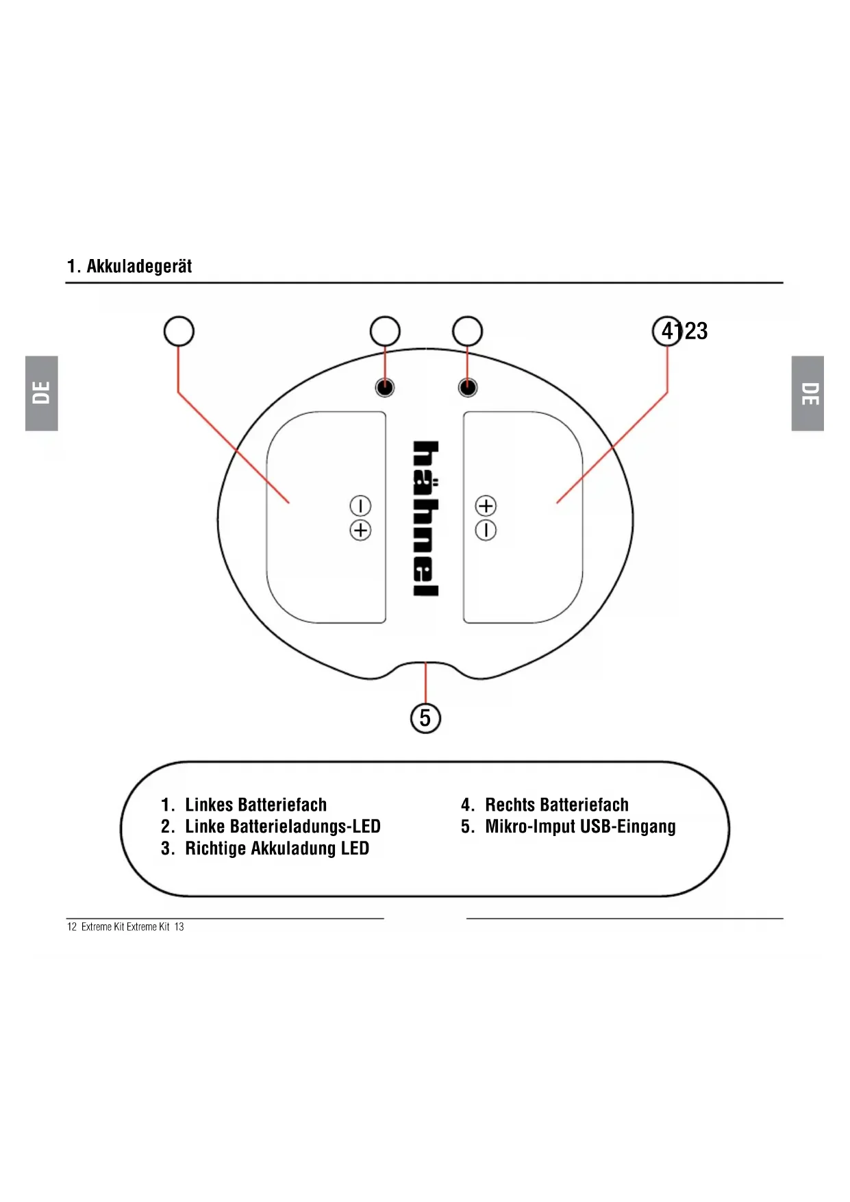 DE16 Extreme Kit Extreme Kit 17 DE Wie nutzen Sie den Charger 1 Schließen Sie den Charger an eine USB Stromquelle an (z.B. USB Stromstecker, USB Kfz Stecker, PC oder Laptop…) Für optimale Ladezeiten muss der USB Stromstecker 2.1 Ampere Ausgangsleistung bieten. Die USB Stromversorgung wird an dem Charger“ mit einem Micro USB Kabel angeschlossen 2 Setzen Sie ein oder zwei Akkus gleichzeitig ins Ladegerät ein. Das Ladegerät lädt Original-, Hähnel- und Akkus von Drittanbietern auf 3 Während der Ladung leuchtet die LED rot. Sobald der Akku vollgeladen ist, ändert sich die LED Farbe in grün. 4 Nachdem die Akkus vollgeladen sind, nehmen Sie diese aus dem „Charger“. Hinweise zum Akku