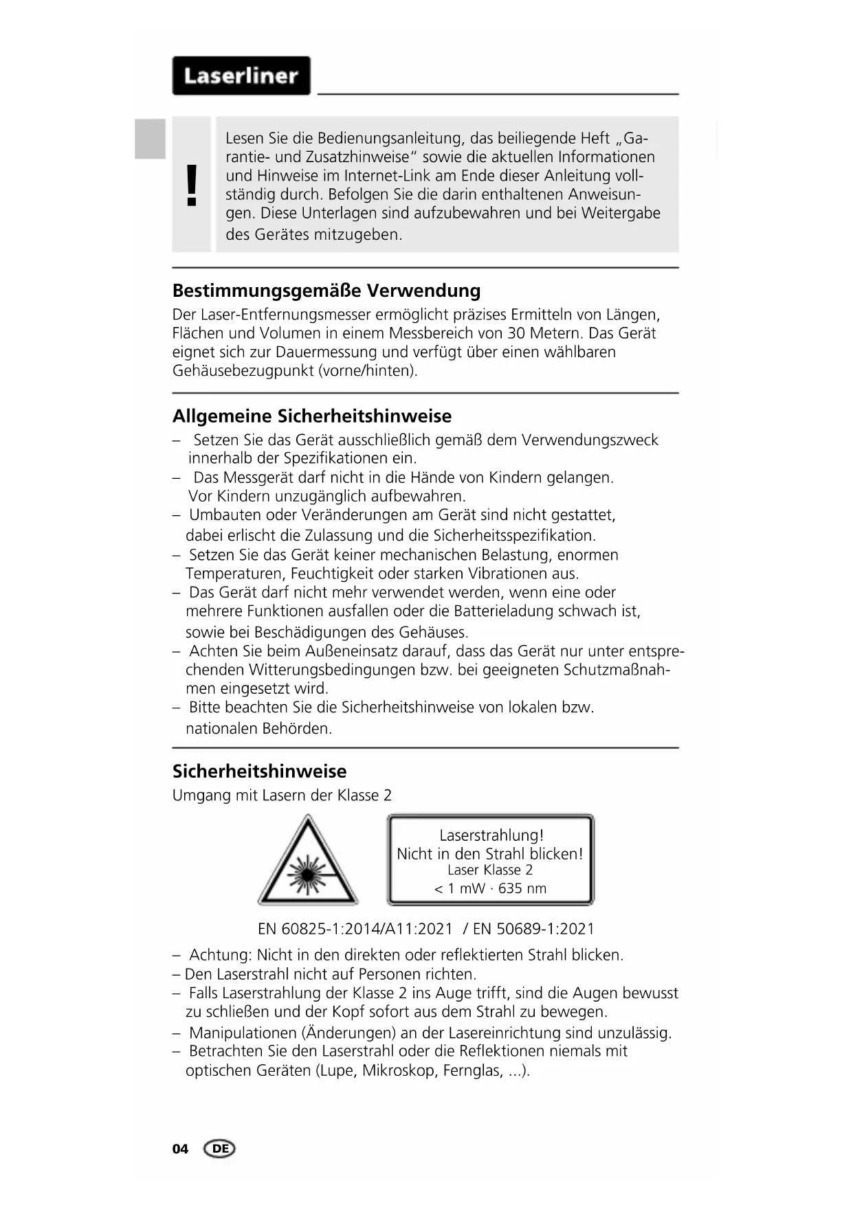 Bestimmungsgemäße Verwendung Der Laser-Entfernungsmesser ermöglicht präzises Ermitteln von Längen, Flächen und Volumen in einem Messbereich von 30 Metern. Das Gerät eignet sich zur Dauermessung und verfügt über einen wählbaren Gehäusebezugpunkt (vorne/hinten). Allgemeine Sicherheitshinweise – Setzen Sie das Gerät ausschließlich gemäß dem Verwendungszweck innerhalb der Spezikationen ein. – Das Messgerät darf nicht in die Hände von Kindern gelangen. Vor Kindern unzugänglich aufbewahren. – Umbauten oder Veränderungen am Gerät sind nicht gestattet, dabei erlischt die Zulassung und die Sicherheitsspezikation. – Setzen Sie das Gerät keiner mechanischen Belastung, enormen Temperaturen, Feuchtigkeit oder starken Vibrationen aus. – Das Gerät darf nicht mehr verwendet werden, wenn eine oder mehrere Funktionen ausfallen oder die Batterieladung schwach ist, sowie bei Beschädigungen des Gehäuses. – Achten Sie beim Außeneinsatz darauf, dass das Gerät nur unter entspre- chenden Witterungsbedingungen bzw. bei geeigneten Schutzmaßnah- men eingesetzt wird. – Bitte beachten Sie die Sicherheitshinweise von lokalen bzw. nationalen Behörden. – Achtung: Nicht in den direkten oder reektierten Strahl blicken. – Den Laserstrahl nicht auf Personen richten. – Falls Laserstrahlung der Klasse 2 ins Auge trifft, sind die Augen bewusst zu schließen und der Kopf sofort aus dem Strahl zu bewegen. – Manipulationen (Änderungen) an der Lasereinrichtung sind unzulässig. – Betrachten Sie den Laserstrahl oder die Reektionen niemals mit optischen Geräten (Lupe, Mikroskop, Fernglas, ...). Sicherheitshinweise Umgang mit Lasern der Klasse 2 Laserstrahlung! Nicht in den Strahl blicken! Laser Klasse 2 < 1 mW · 635 nm EN 60825-1:2014/A11:2021 / EN 50689-1:2021LaserRange-Master i3