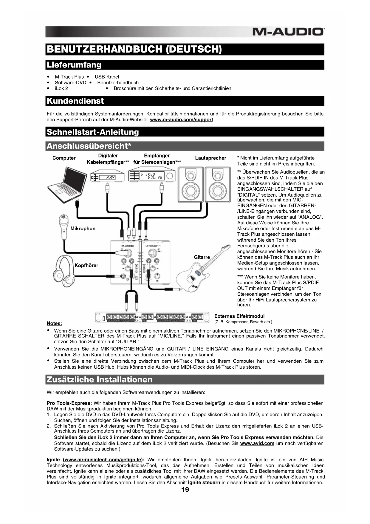 Notes: y Wenn Sie eine Gitarre oder einen Bass mit einem aktiven Tonabnehmer aufnehmen, setzen Sie den MIKROPHONE/LINE / GITARRE SCHALTER des M-Track Plus auf "MIC/LINE." Falls Ihr Instrument einen passiven Tonabnehmer verwendet, setzen Sie den Schalter auf "GUITAR." y Verwenden Sie die MIKROPHONEINGÄNG und GUITAR / LINE EINGÄNG eines Kanals nicht gleichzeitig. Dadurch könnten Sie den Kanal übersteuern, wodurch es zu Verzerrungen kommt. y Stellen Sie eine direkte Verbindung zwischen dem M-Track Plus und Ihrem Computer her und verwenden Sie zum Anschluss keinen USB Hub. Hubs können die Audio- und MIDI-Clock des M-Track Plus stören. Zusätzliche Installationen Wir empfehlen auch die folgenden Softwareanwendungen zu installieren: Pro Tools-Express: Wir haben Ihrem M-Track Plus Pro Tools Express beigefügt, so dass Sie sofort mit einer professionellen DAW mit der Musikproduktion beginnen können.