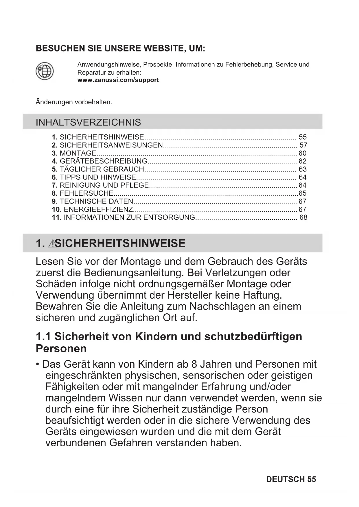 Ihre Pflichten als Endnutzer Dieses Elektro- bzw. Elektronikgerät ist mit einer durchgestrichenen Abfalltonne auf Rädern gekennzeichnet. Das Gerät darf deshalb nur getrennt vom unsortierten Siedlungsabfall gesammelt und zurückgenommen werden, es darf also nicht in den Hausmüll gegeben werden. Das Gerät kann z. B. bei einer kommunalen Sammelstelle oder ggf. bei einem Vertreiber (siehe zu deren Rücknahmepflichten unten) abgegeben werden. Das gilt auch für alle Bauteile, Unterbaugruppen und Verbrauchsmaterialien des zu entsorgenden Altgeräts. Bevor das Altgerät entsorgt werden darf, müssen alle Altbatterien und Altakkumulatoren vom Altgerät getrennt werden, die nicht vom Altgerät umschlossen sind. Das gleiche gilt für Lampen, die zerstörungsfrei aus dem Altgerät entnommen werden können. Der Endnutzer ist zudem selbst dafür verantwortlich, personenbezogene Daten auf dem Altgerät zu löschen. Hinweise zum Recycling Helfen Sie mit, alle Materialien zu recyceln, die mit diesem Symbol gekennzeichnet sind. Entsorgen Sie solche Materialien, insbesondere Verpackungen, nicht im Hausmüll sondern über die bereitgestellten Recyclingbehälter oder die entsprechenden örtlichen Sammelsysteme. Recyceln Sie zum Umwelt- und Gesundheitsschutz auch elektrische und elektronische Geräte. Rücknahmepflichten der Vertreiber in Deutschland Wer auf mindestens 400 m² Verkaufsfläche Elektro- und Elektronikgeräte vertreibt oder sonst geschäftlich an Endnutzer abgibt, ist verpflichtet, bei Abgabe eines neuen Geräts ein Altgerät des Endnutzers der gleichen Geräteart, das im Wesentlichen die gleichen Funktionen wie das neue Gerät erfüllt, am Ort der Abgabe oder in unmittelbarer Nähe hierzu unentgeltlich zurückzunehmen. Das gilt auch für Vertreiber von Lebensmitteln mit einer Gesamtverkaufsfläche von mindestens 800 m², die mehrmals im Kalenderjahr oder dauerhaft Elektro- und Elektronikgeräte anbieten und auf dem Markt bereitstellen. Solche Vertreiber müssen zudem auf 68 DEUTSCHVerlangen des Endnutzers Altgeräte, die in keiner äußeren Abmessung größer als 25 cm sind (kleine Elektrogeräte), im Einzelhandelsgeschäft oder in unmittelbarer Nähe hierzu unentgeltlich zurückzunehmen; die Rücknahme darf in diesem Fall nicht an den Kauf eines Elektro- oder Elektronikgerätes geknüpft, kann aber auf drei Altgeräte pro Geräteart beschränkt werden. Ort der Abgabe ist auch der private Haushalt, wenn das neue Elektro- oder Elektronikgerät dorthin geliefert wird; in diesem Fall ist die Abholung des Altgerätes für den Endnutzer kostenlos. Die vorstehenden Pflichten gelten auch für den Vertrieb unter Verwendung von Fernkommunikationsmitteln, wenn die Vertreiber Lager- und Versandflächen für Elektro- und Elektronikgeräte bzw. Gesamtlager- und -versandflächen für Lebensmittel vorhalten, die den oben genannten Verkaufsflächen entsprechen. Die unentgeltliche Abholung von Elektro- und Elektronikgeräten ist dann aber auf Wärmeüberträger (z. B. Kühlschrank), Bildschirme, Monitore und Geräte, die Bildschirme mit einer Oberfläche von mehr als 100 cm² enthalten, und Geräte beschränkt, bei denen mindestens eine der äußeren Abmessungen mehr als 50 cm beträgt. Für alle übrigen Elektro- und Elektronikgeräte muss der Vertreiber geeignete Rückgabemöglichkeiten in zumutbarer Entfernung zum jeweiligen Endnutzer gewährleisten; das gilt auch für kleine Elektrogeräte (s.o.), die der Endnutzer zurückgeben will, ohne ein neues Gerät zu kaufen. Rücknahmepflichten von Vertreibern und andere Möglichkeiten der Entsorgung von Elektro- und Elektronikgeräten in der Region Wallonien Vertreiber, die Elektro- und Elektronikgeräte verkaufen, sind verpflichtet, bei der Lieferung von Neugeräten Altgeräte desselben Typs, die im Wesentlichen die gleichen Funktionen wie die Neugeräte erfüllen, kostenlos vom Endverbraucher zurückzunehmen. Dies gilt auch bei der Lieferung von neuen Elektro- und Elektronikgeräten oder beim Fernabsatz. Darüber hinaus ist jeder, der Elektro- und Elektronikgeräte auf einer Verkaufsfläche von mindestens 400 m² verkauft, verpflichtet, Altgeräte, die in keiner äußeren Abmessung größer als 25 cm sind (Elektrokleingeräte), im Ladengeschäft oder in unmittelbarer Nähe kostenlos zurückzunehmen; die Rücknahme darf in diesem Fall nicht vom Kauf eines Elektro- oder Elektronikgerätes abhängig gemacht werden. Die Rücknahme von Elektro- und Elektronikgeräten kann auch auf Containerplätzen oder zugelassenen Recyclinghöfen erfolgen. Für weitere Informationen wenden Sie sich bitte an Ihre Gemeindeverwaltung. DEUTSCH 69VISITE O NOSSO WEBSITE PARA: Obter conselhos de utilização, folhetos, resolução de problemas e informações sobreassistência e reparações:www.zanussi.com/supportSujeito a alterações sem aviso prévio. ÍNDICE 1. INFORMAÇÕES DE SEGURANÇA..............................................................702. INSTRUÇÕES DE SEGURANÇA................................................................. 72