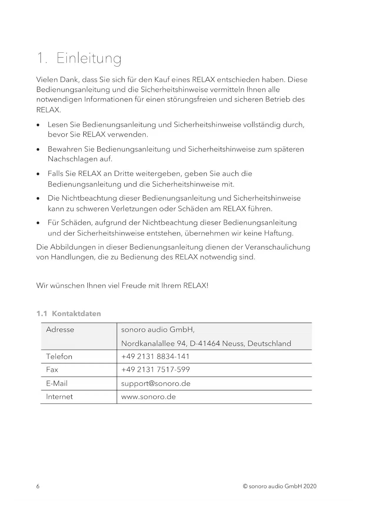 Garantien omfatter ikke batterier, skader forårsaget af forkert brug, normal slitage samt defekter der kun minimalt påvirker værdien eller brugbarheden af RELAX. Garantien bortfalder også i tilfælde af ændringer, der ikke er foretaget af vores autoriserede servicecenter.sonoro.deDEUTSCHLAND - HQ +49 2131 8834141 support@sonoro.de WIR DANKEN IHNEN FÜR IHR VERTRAUEN Bei der Entwicklung und Produktion unserer Musiksysteme legen wir größten Wert auf Qualität und höchstmögliche Sorgfalt. Dazu gehört auch, dass jedes einzelne Musiksystem vor dem Verlassen des Werkes auf Herz und Nieren geprüft wird. Es ist uns daher besonders wichtig, dass Sie nach dem Kauf noch lange Freude an Ihrem sonoro Musiksystem haben. Ist der Inhalt unvollständig oder beschädigt? Gibt es Anlass zu Beanstandungen? Wir lassen Sie mit Ihren Fragen nicht allein. Verlassen Sie sich auf das Know-how unserer Service-Mitarbeiter. Unser Service-Team weiß alles, was es über die sonoro Produkte zu wissen gibt und berät Sie freundlich, schnell und kompetent.