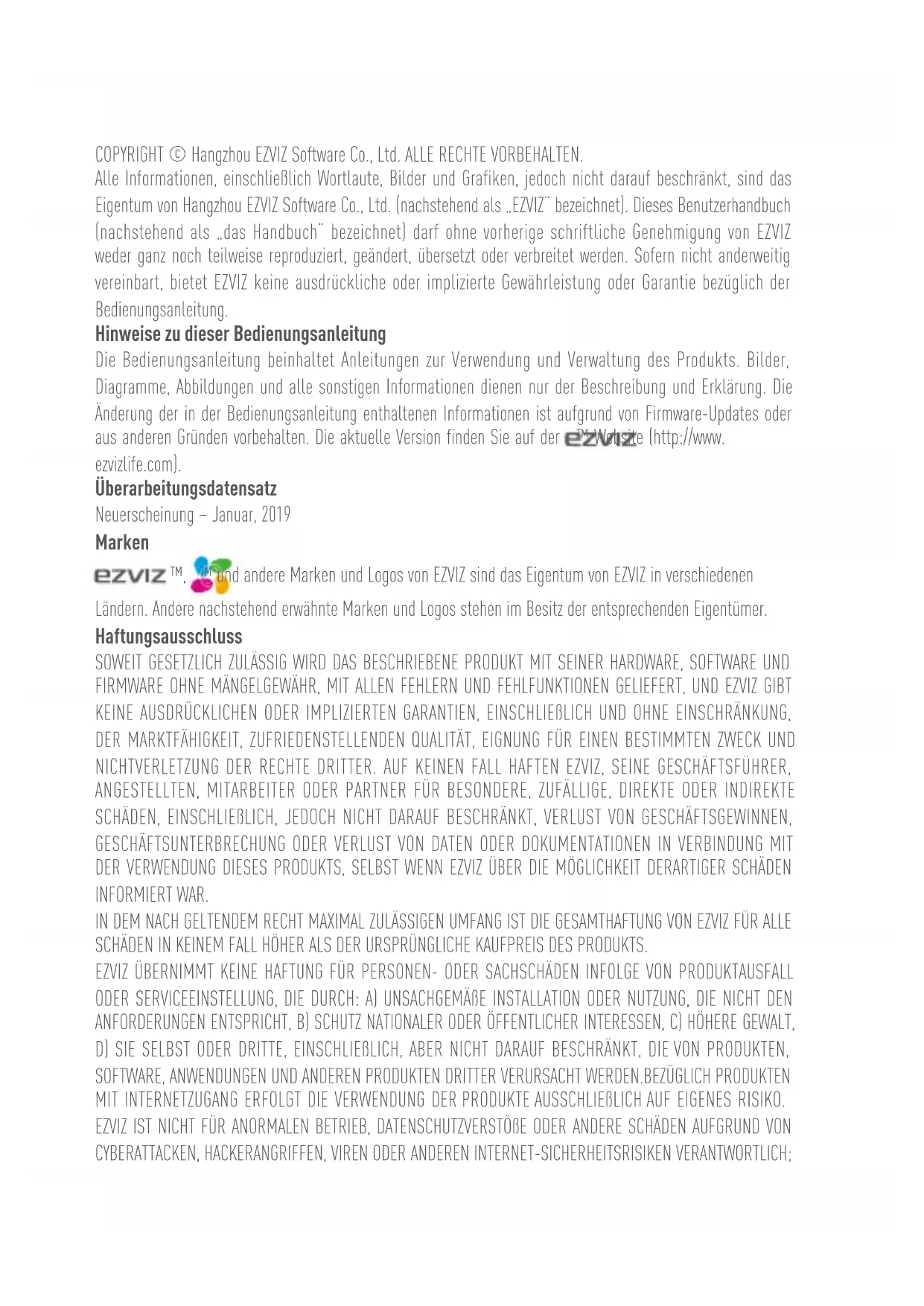 - Routine cleaning, normal cosmetic and mechanical wear and tear. Please do not hesitate to contact your seller or our Customer Service, with any questions.EINGESCHRÄNKTE GARANTIE Vielen Dank, dass Sie sich für Produkte der Hangzhou EZVIZ Software Co.,Ltd. (EZVIZ) entschieden haben. Diese eingeschränkte Garantie („Garantie“) gibt Ihnen, dem Erstkäufer des EZVIZ-Produkts, spezifische Rechtsansprüche. Sie können auch andere gesetzliche Rechte haben, die je nach Staat, Provinz oder Gerichtsbarkeit variieren. Diese Garantie gilt nur für den Erstkäufer des Produkts. „Erstkäufer“ ist jeder Verbraucher, der das EZVIZ-Produkt bei einem autorisierten Verkäufer gekauft hat. Die Haftungsausschlüsse, Ausschlüsse und Beschränkungen der Haftung im Rahmen dieser Garantie gelten nicht, soweit sie durch geltendes Recht verboten sind. Kein Vertriebspartner, Wiederverkäufer, Vertreter oder Mitarbeiter ist berechtigt, Änderungen, Erweiterungen oder Ergänzungen dieser Garantie vorzunehmen. Für Ihr EZVIZ-Produkt gilt eine Garantie von zwei (2) Jahren ab Kaufdatum gegen Material- und Verarbeitungsfehler oder eine längere Zeitspanne, die das Gesetz des Landes oder Bundesstaates, in dem dieses Produkt verkauft wird, vorschreibt, wenn es normalerweise gemäß der Bedienungsanleitung verwendet wird. Sie können Garantieleistungen anfordern, indem Sie sich an unseren Kundendienst wenden. Für defekte EZVIZ-Produkte im Rahmen der Garantie wird EZVIZ nach eigenem Ermessen (i) Ihr Produkt kostenlos reparieren oder ersetzen, (ii) Ihr Produkt gegen ein funktional gleichwertiges Produkt austauschen, oder (iii) den ursprünglichen Kaufpreis zurückerstatten, vorausgesetzt, Sie legen die Original-Kaufquittung oder deren Kopie, eine kurze Erklärung des Defekts und das Produkt in der Originalverpackung vor. Nach eigenem Ermessen kann EZVIZ eine Reparatur oder einen Austausch mit einem neuen oder überholten Produkt oder Komponenten durchführen. Diese Garantie deckt nicht die Versandkosten, die Versicherung oder andere Nebenkosten, die Ihnen bei der Rücksendung des Produkts entstehen. Sofern nicht durch geltendes Recht verboten, ist dies Ihr einziges und ausschließliches Rechtsmittel bei Verletzung dieser Garantie. Jedes Produkt, das im Rahmen dieser Garantie repariert oder ersetzt wurde, unterliegt den Bedingungen dieser Garantie für die Dauer von neunzig (90) Tagen ab Lieferdatum oder der verbleibenden ursprünglichen Garantiezeit. Diese Garantie gilt nicht und ist unter folgenden Bedingungen ungültig: