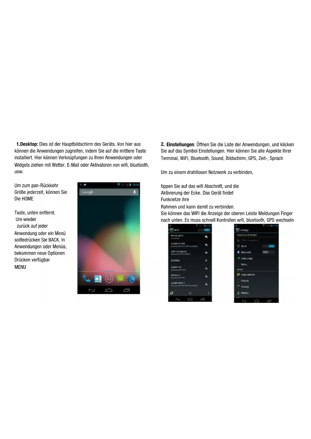 Einstellungen: Öffnen Sie die Liste der Anwendungen, und klicken Sie auf das Symbol Einstellungen. Hier können Sie alle Aspekte Ihrer Terminal, WiFi, Bluetooth, Sound, Bildschirm, GPS, Zeit-, Sprach Um zu einem drahtlosen Netzwerk zu verbinden, tippen Sie auf das wifi Abschnitt, und die Aktivierung der Ecke. Das Gerät findet Funknetze ihre Rahmen und kann damit zu verbinden. Sie können das WIFI die Anzeige der oberen Leiste Meldungen Finger nach unten. Es muss schnell Kontrollen wifi, bluetooth, GPS wechseln3. Anwendungen: Für die Installation von Anwendungen benötigen ein Google Mail-Konto mit Ihrem Gerät verknüpft, um von Google Play herunterladen. Die Anwendungen sind in Telefonspeicher installiert, wobei diese begrenzten Raum. Vermeiden Sie unnötige Anwendungen um Platz zu sparen.