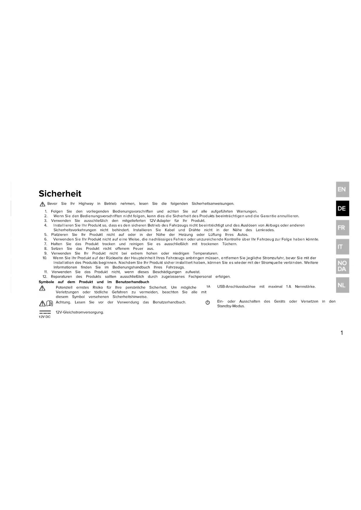 USB-Anschlussbuchse mit maximal 1A Nennstärke. Achtung. Lesen Sie vor der Verwendung das Benutzerhandbuch. Ein- oder Ausschalten des Geräts oder Versetzen in den Standby-Modus. 12V DC 12V-Gleichstromversorgung.