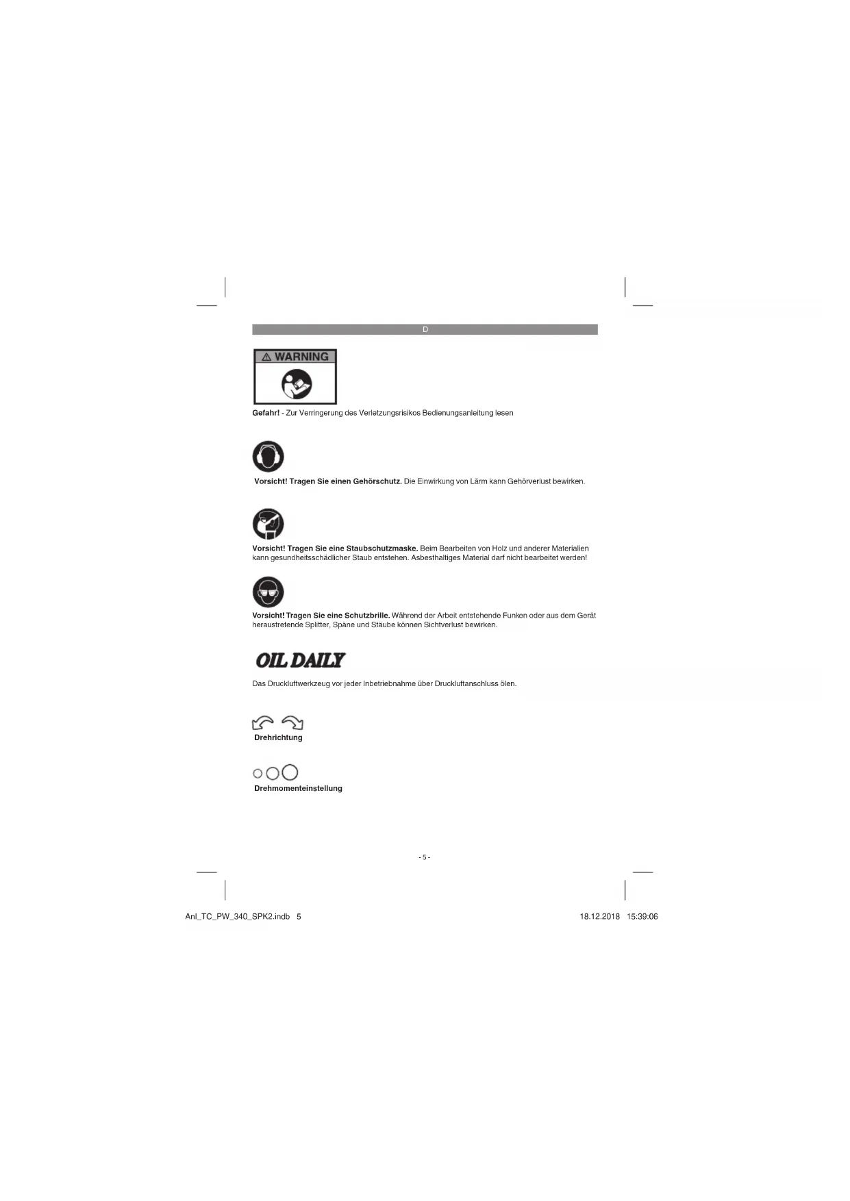 Drehrichtung Drehmomenteinstellung Gefahr! - Zur Verringerung des Verletzungsrisikos Bedienungsanleitung lesen Vorsicht! Tragen Sie einen Gehörschutz. Die Einwirkung von Lärm kann Gehörverlust bewirken. Vorsicht! Tragen Sie eine Schutzbrille. Während der Arbeit entstehende Funken oder aus dem Gerät heraustretende Splitter, Späne und Stäube können Sichtverlust bewirken. Vorsicht! Tragen Sie eine Staubschutzmaske. Beim Bearbeiten von Holz und anderer Materialien kann gesundheitsschädlicher Staub entstehen. Asbesthaltiges Material darf nicht bearbeitet werden! Das Druckluftwerkzeug vor jeder Inbetriebnahme über Druckluftanschluss ölen. Anl_TC_PW_340_SPK2.indb 5Anl_TC_PW_340_SPK2.indb 5 18.12.2018 15:39:0618.12.2018 15:39:06D