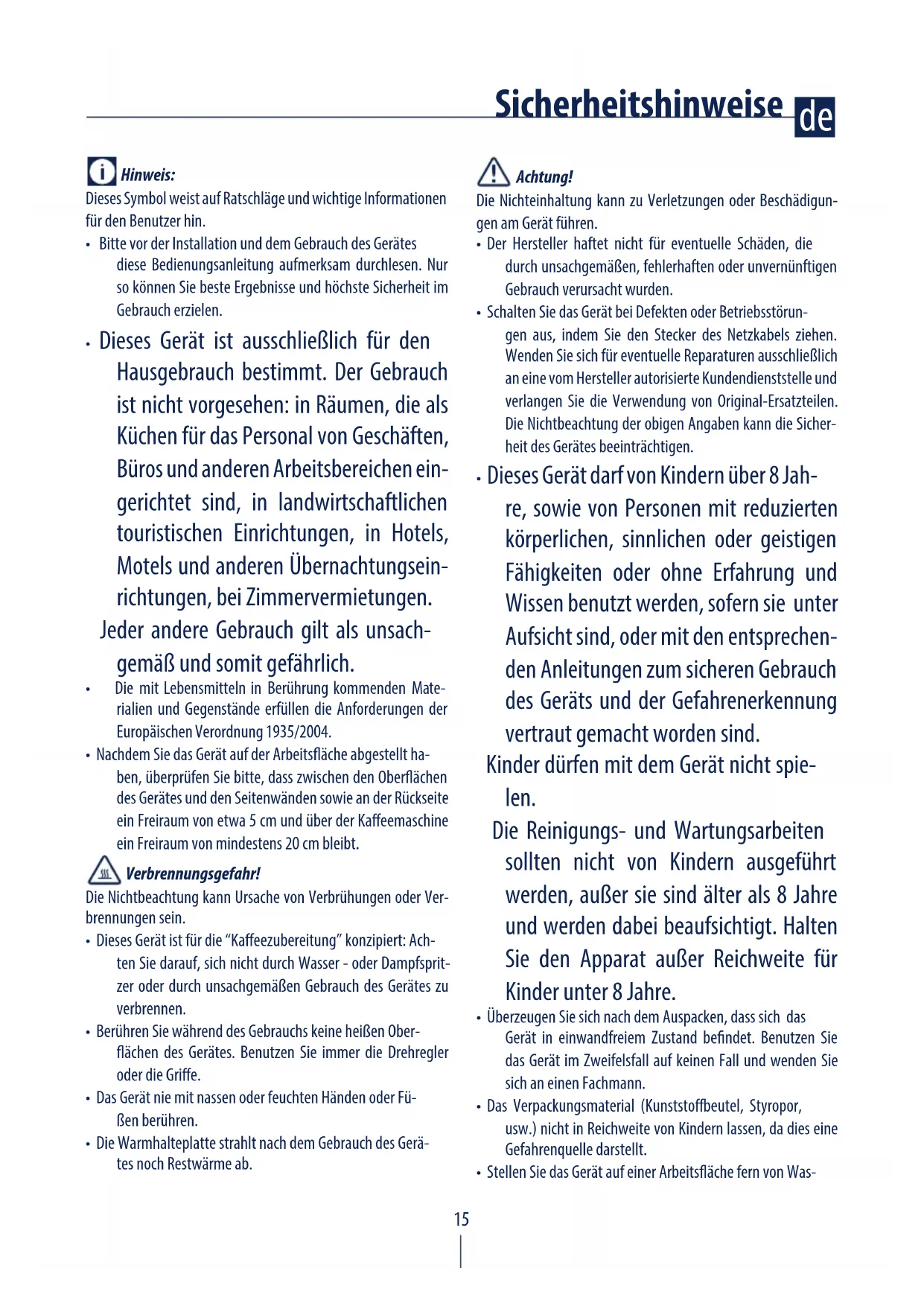 - Dieses Gerät darf von Kindern über 8 Jah- re, sowie von Personen mit reduzierten körperlichen, sinnlichen oder geistigen Fähigkeiten oder ohne Erfahrung und Wissen benutzt werden, sofern sie unter Aufsicht sind, oder mit den entsprechen- den Anleitungen zum sicheren Gebrauch des Geräts und der Gefahrenerkennung vertraut gemacht worden sind. Kinder dürfen mit dem Gerät nicht spie- len. Die Reinigungs- und Wartungsarbeiten sollten nicht von Kindern ausgeführt werden, außer sie sind älter als 8 Jahre und werden dabei beaufsichtigt. Halten Sie den Apparat außer Reichweite für Kinder unter 8 Jahre.