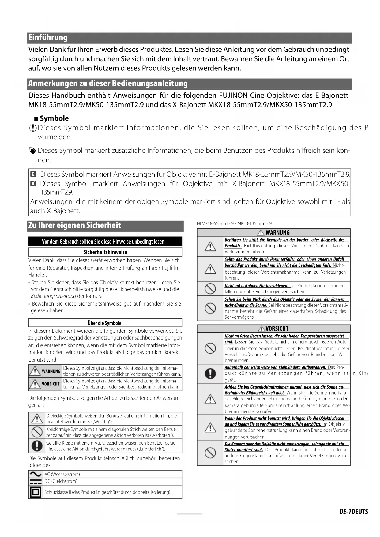 - Bewahren Sie diese Sicherheitshinweise gut auf, nachdem Sie sie gelesen haben. Über die Symbole In diesem Dokument werden die folgenden Symbole verwendet. Sie zeigen den Schweregrad der Verletzungen oder Sachbeschädigungen an, die entstehen können, wenn die mit dem Symbol markierte Infor- mation ignoriert wird und das Produkt als Folge davon nicht korrekt benutzt wird. WARNUNGDieses Symbol zeigt an, dass die Nichtbeachtung der Informa-tionen zu schweren oder tödlichen Verletzungen führen kann.VORSICHTDieses Symbol zeigt an, dass die Nichtbeachtung der Informa-tionen zu Verletzungen oder Sachbeschädigung führen kann. Die folgenden Symbole zeigen die Art der zu beachtenden Anweisun- gen an. Dreieckige Symbole weisen den Benutzer auf eine Information hin, die beachtet werden muss („Wichtig“).Kreisförmige Symbole mit einem diagonalen Strich weisen den Benut-zer darauf hin, dass die angegebene Aktion verboten ist („Verboten“).Gefüllte Kreise mit einem Ausrufezeichen weisen den Benutzer darauf hin, dass eine Aktion durchgeführt werden muss („Erforderlich“). Die Symbole auf diesem Produkt (einschließlich Zubehör) bedeuten folgendes: AC (Wechselstrom)DC (Gleichstrom)Schutzklasse II (das Produkt ist geschützt durch doppelte Isolierung)E MK18-55mmT2.9 / MK50-135mmT2.9
