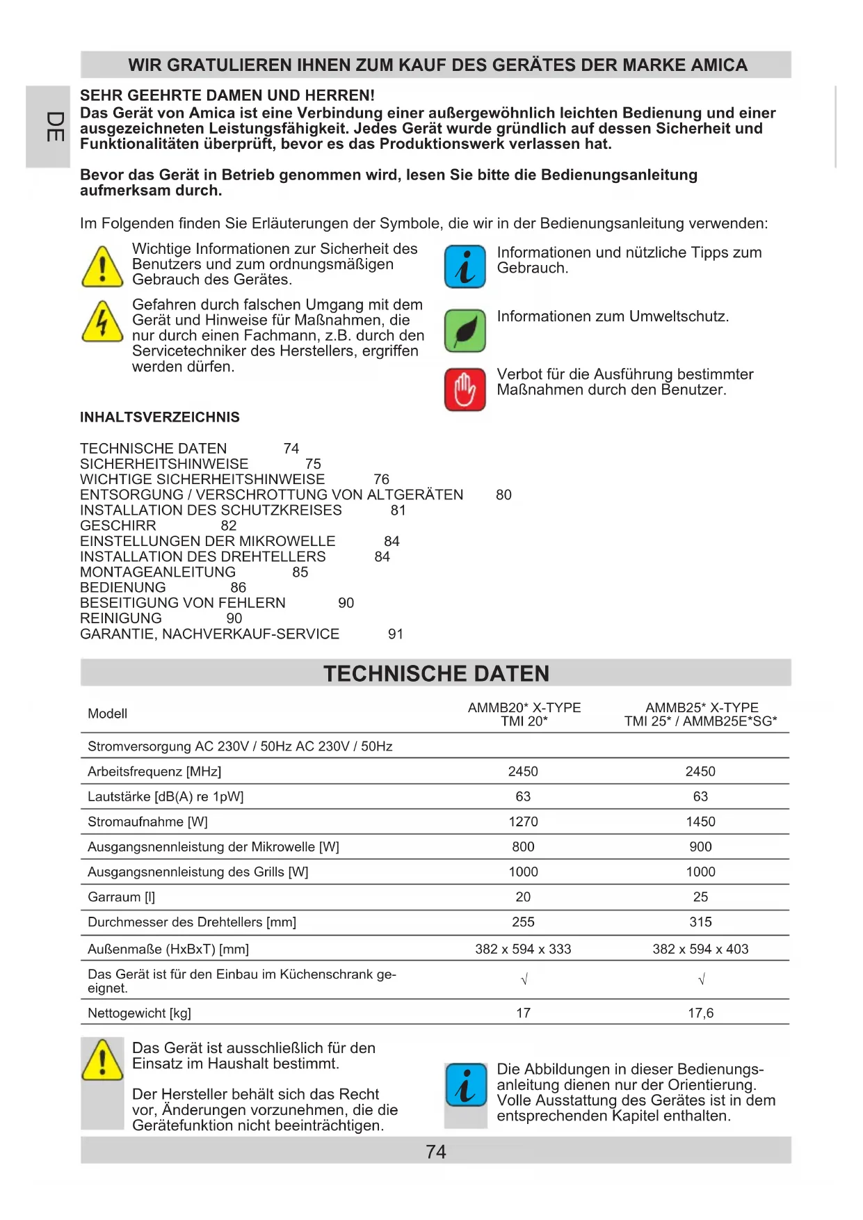 Die Abbildungen in dieser Bedienungs-anleitung dienen nur der Orientierung. Volle Ausstattung des Gerätes ist in dem entsprechenden Kapitel enthalten. TECHNISCHE DATEN INHALTSVERZEICHNISTECHNISCHE DATEN 74SICHERHEITSHINWEISE 75WICHTIGE SICHERHEITSHINWEISE 76ENTSORGUNG / VERSCHROTTUNG VON ALTGERÄTEN 80INSTALLATION DES SCHUTZKREISES 81GESCHIRR 82EINSTELLUNGEN DER MIKROWELLE 84INSTALLATION DES DREHTELLERS 84MONTAGEANLEITUNG 85BEDIENUNG 86BESEITIGUNG VON FEHLERN 90REINIGUNG 90GARANTIE, NACHVERKAUF-SERVICE 91 ModellAMMB20* X-TYPETMI 20*AMMB25* X-TYPETMI 25* / AMMB25E*SG*Stromversorgung AC 230V / 50Hz AC 230V / 50HzArbeitsfrequenz [MHz] 2450 2450Lautstärke [dB(A) re 1pW] 63 63Stromaufnahme [W] 1270 1450 Ausgangsnennleistung der Mikrowelle [W] 800 900 Ausgangsnennleistung des Grills [W] 1000 1000Garraum [l] 20 25Durchmesser des Drehtellers [mm] 255 315Außenmaße (HxBxT) [mm] 382 x 594 x 333 382 x 594 x 403Das Gerät ist für den Einbau im Küchenschrank ge-eignet.√ √Nettogewicht [kg] 17 17,675 SICHERHEITSHINWEISE