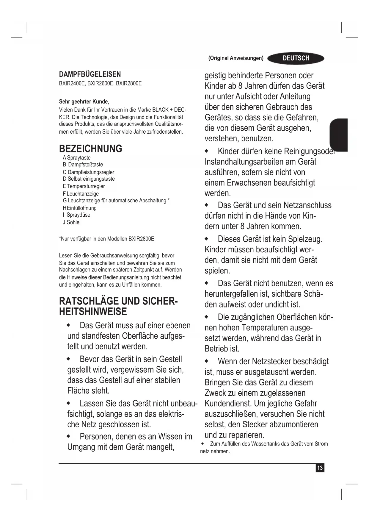 Sehr geehrter Kunde, Vielen Dank für Ihr Vertrauen in die Marke BLACK + DEC- KER. Die Technologie, das Design und die Funktionalität dieses Produkts, das die anspruchsvollsten Qualitätsnor- men erfüllt, werden Sie über viele Jahre zufriedenstellen. BEZEICHNUNG A Spraytaste B Dampfstoßtaste C Dampeistungsregler D Selbstreinigungstaste E Temperaturregler F Leuchtanzeige G Leuchtanzeige für automatische Abschaltung * H Einfüllöffnung I Spraydüse J Sohle *Nur verfügbar in den Modellen BXIR2800E Lesen Sie die Gebrauchsanweisung sorgfältig, bevor Sie das Gerät einschalten und bewahren Sie sie zum Nachschlagen zu einem späteren Zeitpunkt auf. Werden die Hinweise dieser Bedienungsanleitung nicht beachtet und eingehalten, kann es zu Unfällen kommen.