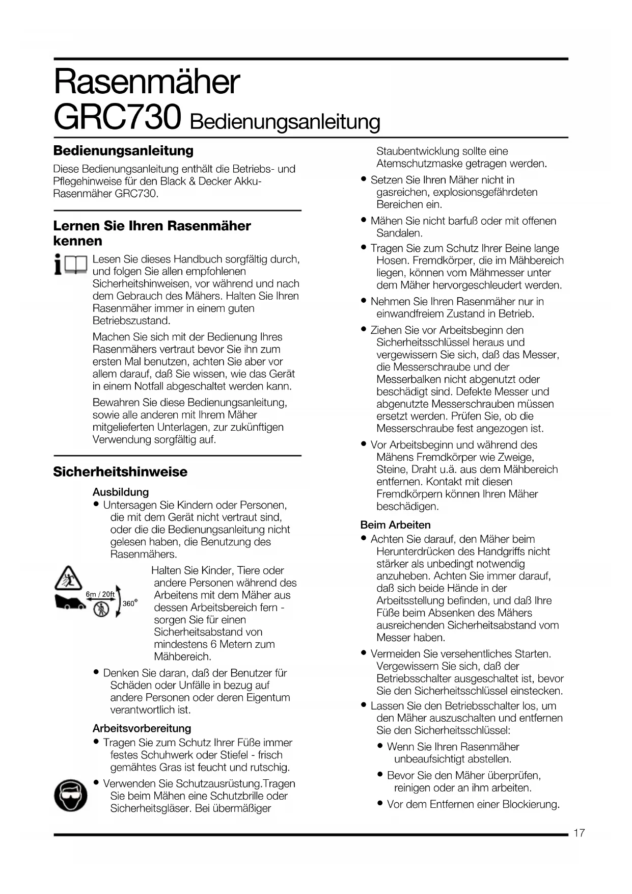 6m / 20ft Halten Sie Kinder, Tiere oder andere Personen während des Arbeitens mit dem Mäher aus dessen Arbeitsbereich fern - sorgen Sie für einen Sicherheitsabstand von mindestens 6 Metern zum Mähbereich.