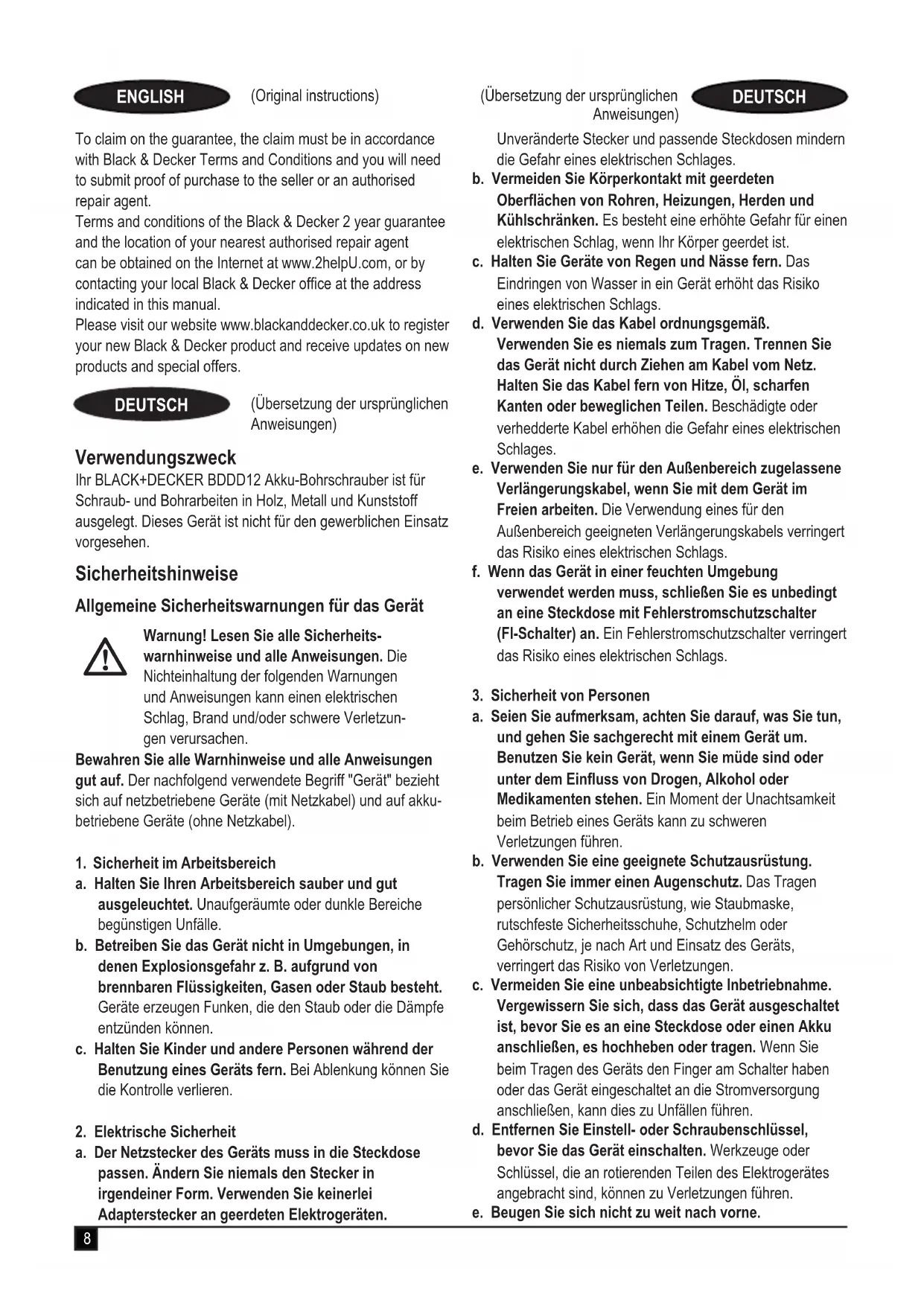 ENGLISH (Original instructions) (Übersetzung der ursprünglichen Anweisungen) DEUTSCH Verwendungszweck Ihr BLACK+DECKER BDDD12 Akku-Bohrschrauber ist für Schraub- und Bohrarbeiten in Holz, Metall und Kunststoff ausgelegt. Dieses Gerät ist nicht für den gewerblichen Einsatz vorgesehen. Sicherheitshinweise Allgemeine Sicherheitswarnungen für das Gerät