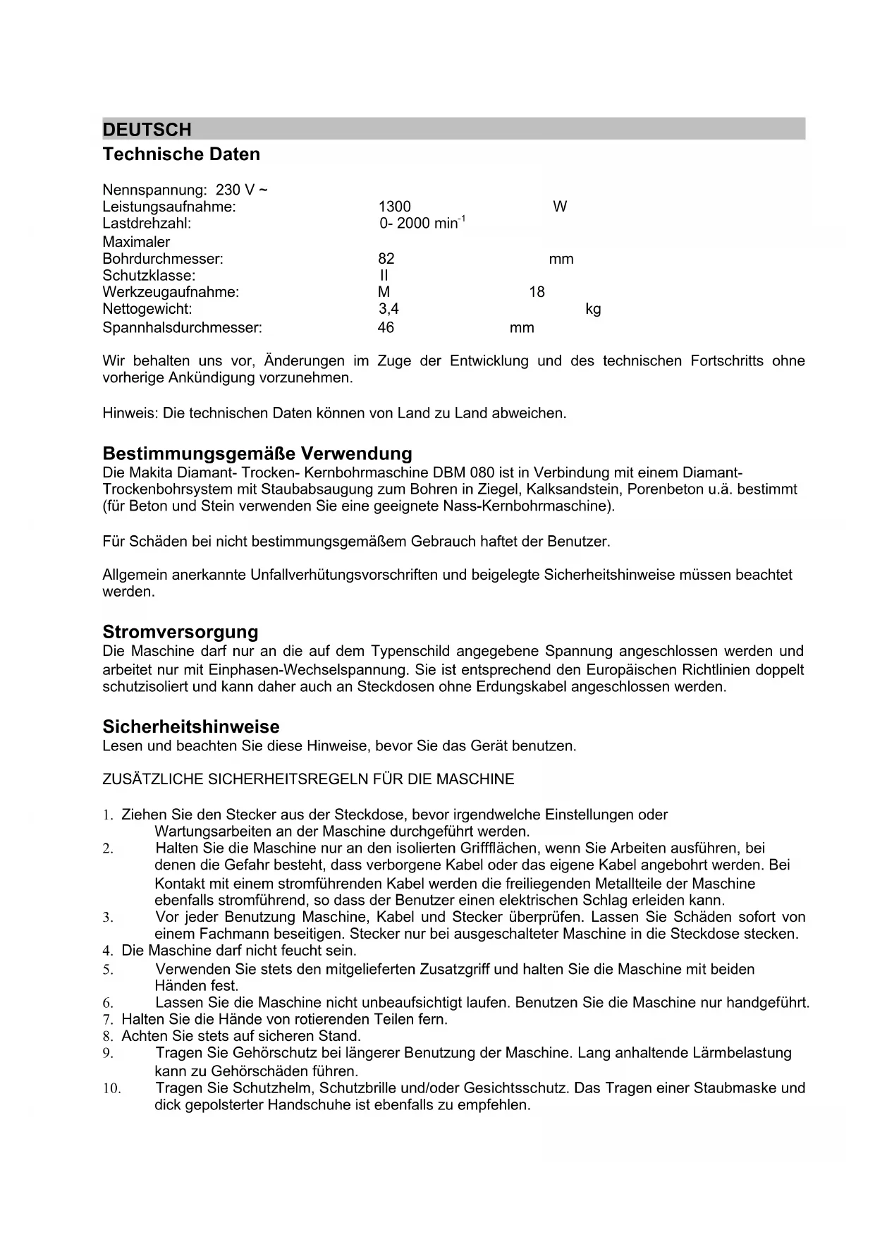 Maximaler Bohrdurchmesser: 82 mm Schutzklasse: II Werkzeugaufnahme: M 18 Nettogewicht: 3,4 kg Spannhalsdurchmesser: 46 mm Wir behalten uns vor, Änderungen im Zuge der Entwicklung und des technischen Fortschritts ohne vorherige Ankündigung vorzunehmen. Hinweis: Die technischen Daten können von Land zu Land abweichen. Bestimmungsgemäße Verwendung Die Makita Diamant- Trocken- Kernbohrmaschine DBM 080 ist in Verbindung mit einem Diamant- Trockenbohrsystem mit Staubabsaugung zum Bohren in Ziegel, Kalksandstein, Porenbeton u.ä. bestimmt (für Beton und Stein verwenden Sie eine geeignete Nass-Kernbohrmaschine). Für Schäden bei nicht bestimmungsgemäßem Gebrauch haftet der Benutzer. Allgemein anerkannte Unfallverhütungsvorschriften und beigelegte Sicherheitshinweise müssen beachtet werden. Stromversorgung Die Maschine darf nur an die auf dem Typenschild angegebene Spannung angeschlossen werden und arbeitet nur mit Einphasen-Wechselspannung. Sie ist entsprechend den Europäischen Richtlinien doppelt schutzisoliert und kann daher auch an Steckdosen ohne Erdungskabel angeschlossen werden. Sicherheitshinweise Lesen und beachten Sie diese Hinweise, bevor Sie das Gerät benutzen. ZUSÄTZLICHE SICHERHEITSREGELN FÜR DIE MASCHINE