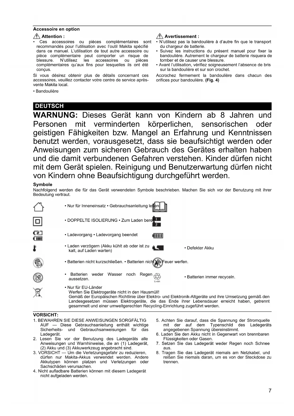 - Avant l’utilisation, vérifiez soigneusement l’absence de bris sur la bandoulière et sur son crochet. Accrochez fermement la bandoulière dans chacun des orifices pour bandoulière. (Fig. 4) WARNUNG: Dieses Gerät kann von Kindern ab 8 Jahren und Personen mit verminderten körperlichen, sensorischen oder geistigen Fähigkeiten bzw. Mangel an Erfahrung und Kenntnissen benutzt werden, vorausgesetzt, dass sie beaufsichtigt werden oder Anweisungen zum sicheren Gebrauch des Gerätes erhalten haben und die damit verbundenen Gefahren verstehen. Kinder dürfen nicht mit dem Gerät spielen. Reinigung und Benutzerwartung dürfen nicht von Kindern ohne Beaufsichtigung durchgeführt werden. Symbole Nachfolgend werden die für das Gerät verwendeten Symbole beschrieben. Machen Sie sich vor der Benutzung mit ihrer Bedeutung vertraut. VORSICHT: