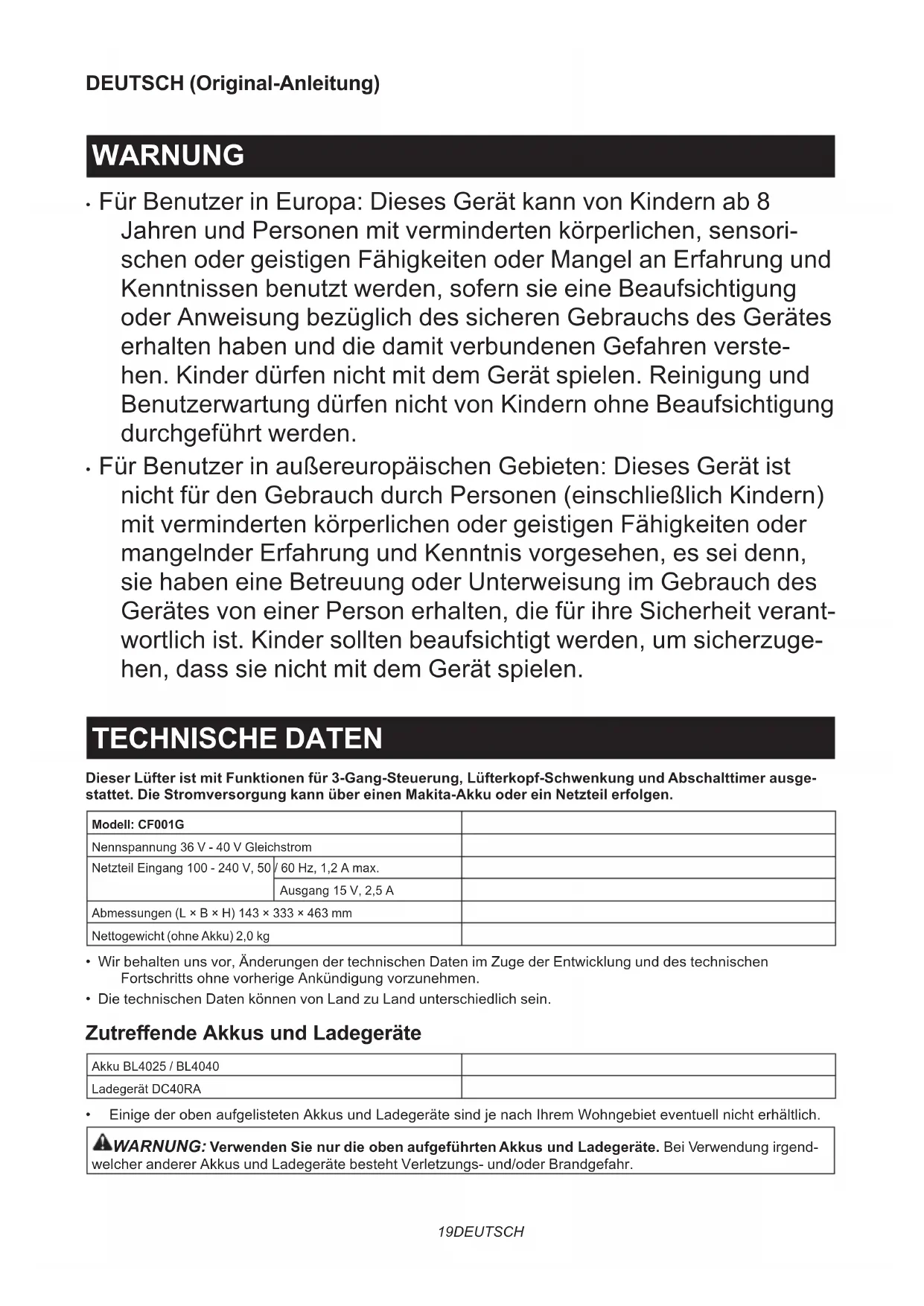 - Für Benutzer in außereuropäischen Gebieten: Dieses Gerät ist nicht für den Gebrauch durch Personen (einschließlich Kindern) mit verminderten körperlichen oder geistigen Fähigkeiten oder mangelnder Erfahrung und Kenntnis vorgesehen, es sei denn, sie haben eine Betreuung oder Unterweisung im Gebrauch des Gerätes von einer Person erhalten, die für ihre Sicherheit verant- wortlich ist. Kinder sollten beaufsichtigt werden, um sicherzuge- hen, dass sie nicht mit dem Gerät spielen. TECHNISCHE DATEN Dieser Lüfter ist mit Funktionen für 3-Gang-Steuerung, Lüfterkopf-Schwenkung und Abschalttimer ausge- stattet. Die Stromversorgung kann über einen Makita-Akku oder ein Netzteil erfolgen. Modell: CF001GNennspannung 36 V - 40 V GleichstromNetzteil Eingang 100 - 240 V, 50 / 60 Hz, 1,2 A max.Ausgang 15 V, 2,5 AAbmessungen (L × B × H) 143 × 333 × 463 mmNettogewicht (ohne Akku) 2,0 kg