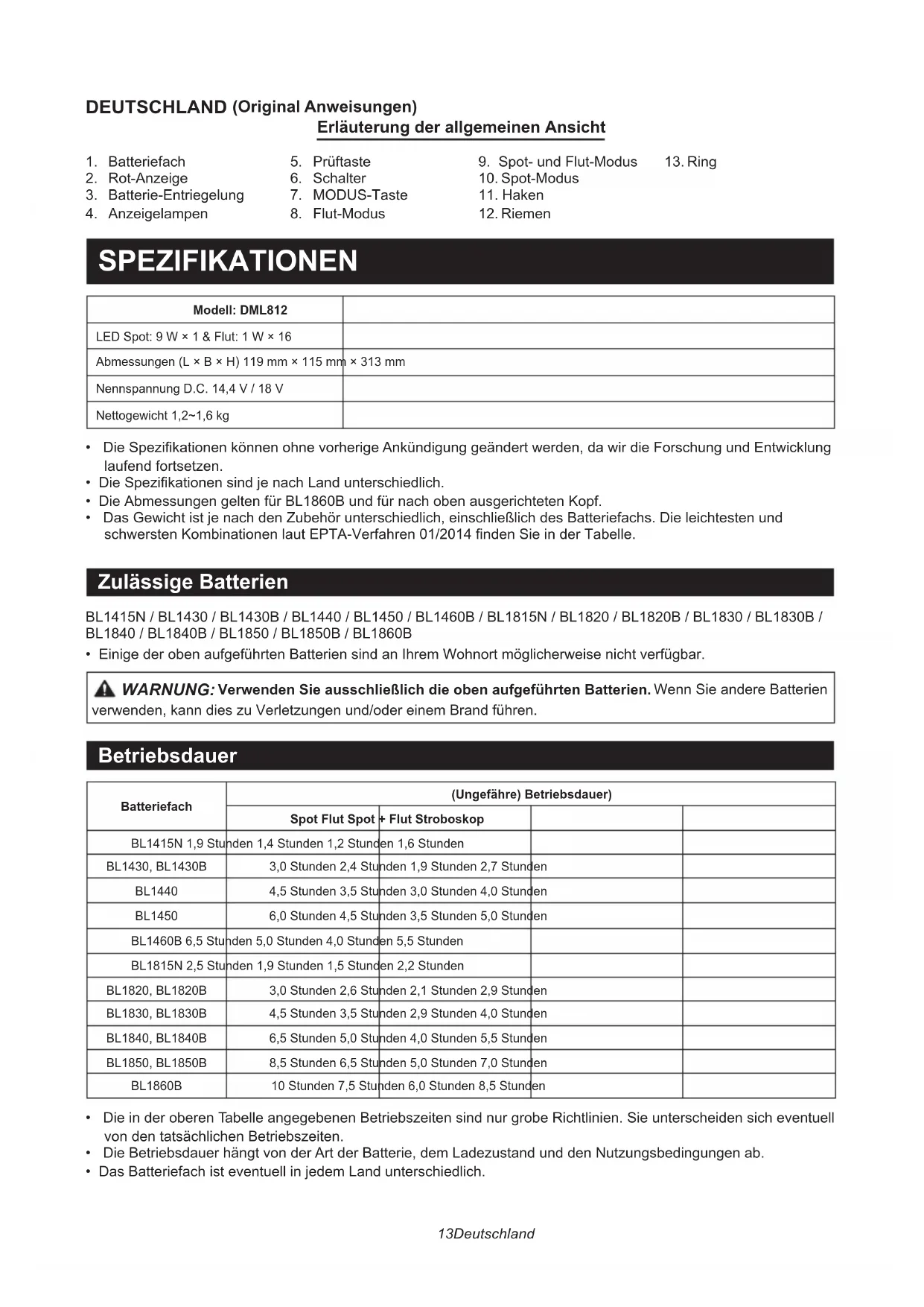 - Einige der oben aufgeführten Batterien sind an Ihrem Wohnort möglicherweise nicht verfügbar. WARNUNG: Verwenden Sie ausschließlich die oben aufgeführten Batterien. Wenn Sie andere Batterien verwenden, kann dies zu Verletzungen und/oder einem Brand führen. Betriebsdauer Batteriefach(Ungefähre) Betriebsdauer)Spot Flut Spot + Flut StroboskopBL1415N 1,9 Stunden 1,4 Stunden 1,2 Stunden 1,6 StundenBL1430, BL1430B 3,0 Stunden 2,4 Stunden 1,9 Stunden 2,7 StundenBL1440 4,5 Stunden 3,5 Stunden 3,0 Stunden 4,0 StundenBL1450 6,0 Stunden 4,5 Stunden 3,5 Stunden 5,0 StundenBL1460B 6,5 Stunden 5,0 Stunden 4,0 Stunden 5,5 StundenBL1815N 2,5 Stunden 1,9 Stunden 1,5 Stunden 2,2 StundenBL1820, BL1820B 3,0 Stunden 2,6 Stunden 2,1 Stunden 2,9 StundenBL1830, BL1830B 4,5 Stunden 3,5 Stunden 2,9 Stunden 4,0 StundenBL1840, BL1840B 6,5 Stunden 5,0 Stunden 4,0 Stunden 5,5 StundenBL1850, BL1850B 8,5 Stunden 6,5 Stunden 5,0 Stunden 7,0 StundenBL1860B 10 Stunden 7,5 Stunden 6,0 Stunden 8,5 Stunden
