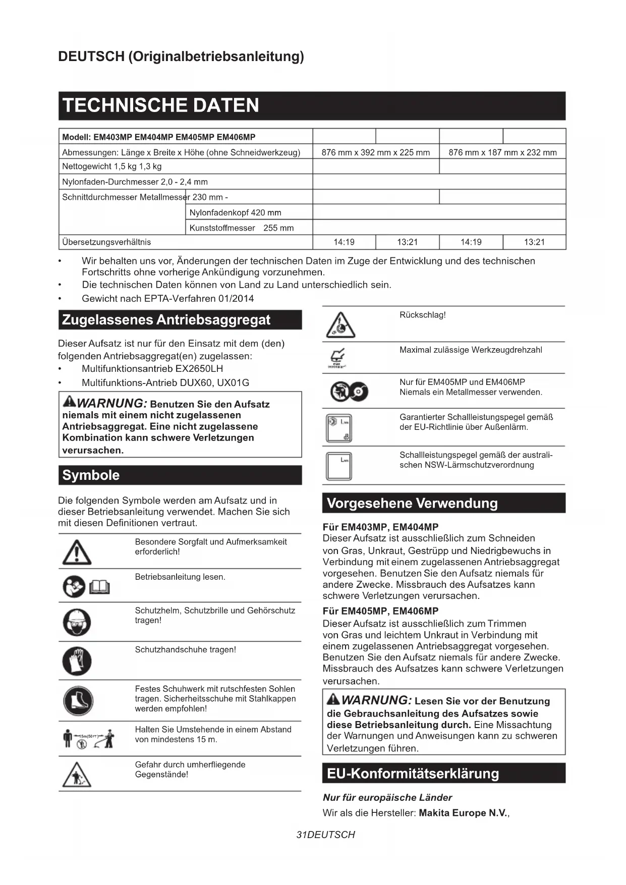 Antriebsaggregat In der Gebrauchsanleitung des Antriebsaggregats nachschlagen. UmdieSICHERHEITundZUVERLÄSSIGKEITdiesesProduktszugewährleisten,solltenReparaturenundandere Wartungs-oderEinstellarbeitennurvonMakita-VertragswerkstättenoderMakita-Kundendienstzentrenunteraus- schließlicherVerwendungvonMakita-Originalersatzteilenausgeführtwerden.41 DEUTSCH FEHLERSUCHE BevorSiedenReparaturdienstanrufen,führenSiezunächstIhreeigeneInspektiondurch.FallsSieeinProblemn- den,dasnichtinderAnleitungerläutertwird,versuchenSienicht,dieMaschinezuzerlegen.WendenSiesichstatt- dessenanautorisierteMakita-Service-Center,undachtenSiedarauf,dassstetsMakita-ErsatzteilefürReparaturen verwendet werden. Zustand der Unregelmäßigkeit Wahrscheinliche Ursache (Funktionsstörung) Abhilfemaßnahme Der Motor läuft nicht an. - In der Gebrauchsanleitung des Antriebsaggregats nachschlagen. Der Motor bleibt sofort wieder stehen. - In der Gebrauchsanleitung des Antriebsaggregats nachschlagen. DieMotordrehzahlnimmtnichtzu. - In der Gebrauchsanleitung des Antriebsaggregats nachschlagen. Schneidwerkzeugdrehtsichnicht. DenMotorunverzüglich abstellen. Lose Befestigung des Schneidwerkzeugs Einwandfreifestziehen. EinZweighatsichimSchneidwerkzeug verfangen. Fremdkörper entfernen Anomales Antriebssystem WendenSiesichbezüglicheinerReparaturanein autorisiertes Service-Center. Haupteinheit vibriert ungewöhnlich stark. DenMotorunverzüglich abstellen. Schneidwerkzeuggebrochen,verbogen oderabgenutzt Schneidwerkzeugaustauschen. Lose Befestigung des Schneidwerkzeugs Einwandfreifestziehen. Ein Ende des Nylonschneidfadens ist abgebrochen, und der Nylonfadenkopf ist unausgeglichen geworden. Schieben Sie den Nylonschneidfaden vor, indem Sie den Nylonfadenkopf auf den Boden aufklopfen. Irreguläre Anbringung des Schneidwerkzeugs Einwandfrei anbringen. Anomales Antriebssystem WendenSiesichbezüglicheinerReparaturanein autorisiertes Service-Center. Schneidmesser bleibt nicht sofort stehen. DenMotorunverzüglich abstellen. Das Antriebsaggregat funktioniert nicht ordnungsgemäß. In der Gebrauchsanleitung des Antriebsaggregats nachschlagen. Der Nylonschneidfaden wird nicht vorgeschoben. Der Faden ist aufgebraucht oder in der Spule verwickelt. DenFadenzurückspulen. Der Nylonschneidfaden wird nicht an der korrekten Länge abgeschnitten. Der Fadenschneider an der Schutzhaubeistbeschädigtodernicht vorhanden. WendenSiesichbezüglicheinerReparaturanein autorisiertes Service-Center. DerFadenwirdüberdieSchutzhaube hinaus vorgeschoben. DenFadenzurückspulen.42 ITALIANO ITALIANO (Istruzioni originali) DATI TECNICI Modello: EM403MP EM404MP EM405MP EM406MP Dimensioni:lunghezzaxlarghezzaxaltezza(utensiledataglio escluso) 876 mm x 392 mm x 225 mm 876 mm x 187 mm x 232 mm Peso netto 1,5 kg 1,3 kg Diametrolodinylon 2,0 - 2,4 mm Diametro di taglio Lama in metallo 230 mm - Testina da taglio in nylon 420 mm Lama di plastica 255 mm Rapporto di trasmissione 14:19 13:21 14:19 13:21