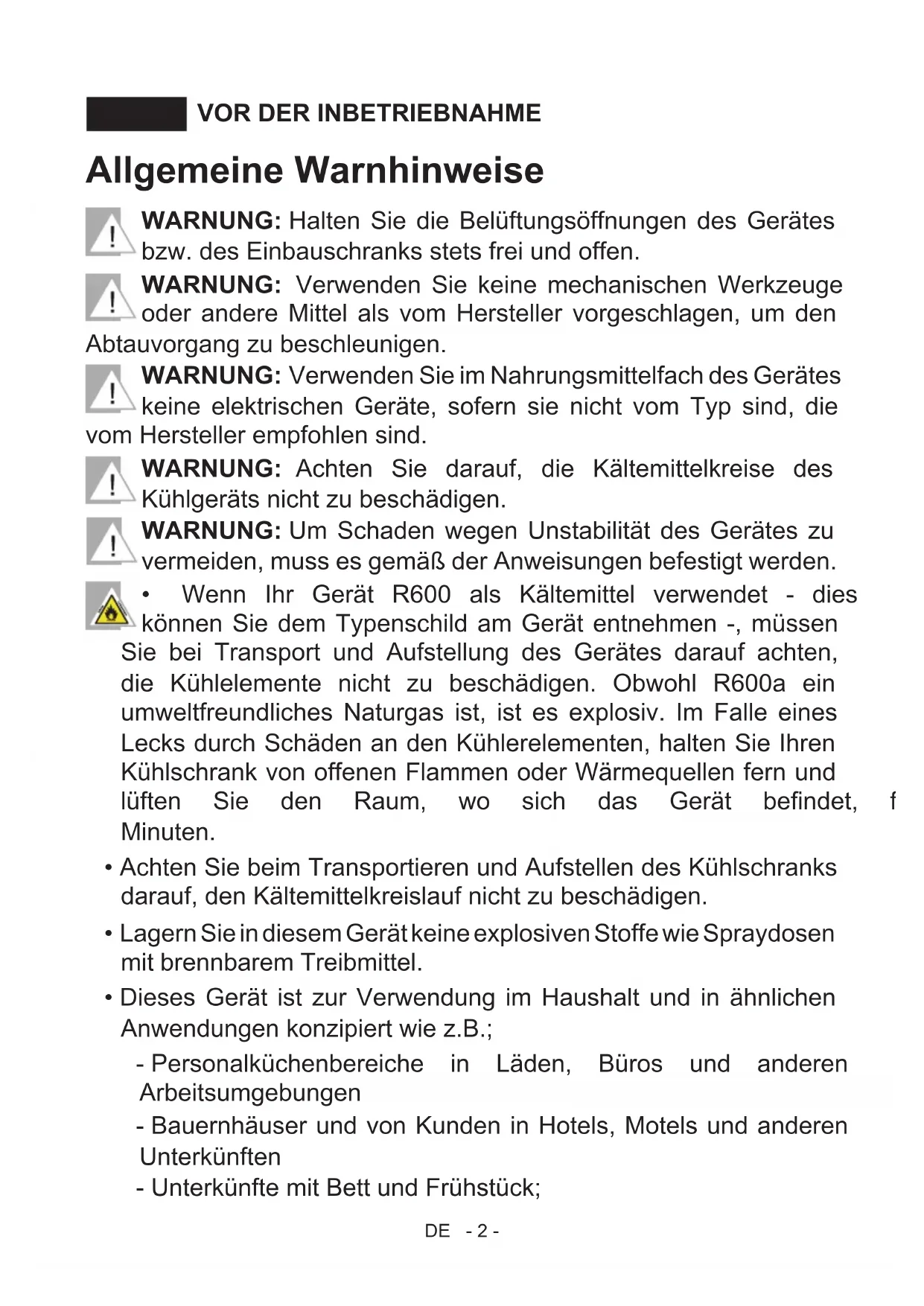 - Wechsel des Türanschlages - Die Bedienungsanleitung gilt für verschiedene Modelle. Deshalb können Unterschiede auftreten.DE - 2 - VOR DER INBETRIEBNAHMETEIL 1. Allgemeine Warnhinweise WARNUNG: Halten Sie die Belüftungsöffnungen des Gerätes bzw. des Einbauschranks stets frei und offen. WARNUNG: Verwenden Sie keine mechanischen Werkzeuge oder andere Mittel als vom Hersteller vorgeschlagen, um den Abtauvorgang zu beschleunigen. WARNUNG: Verwenden Sie im Nahrungsmittelfach des Gerätes keine elektrischen Geräte, sofern sie nicht vom Typ sind, die vom Hersteller empfohlen sind. WARNUNG: Achten Sie darauf, die Kältemittelkreise des Kühlgeräts nicht zu beschädigen. WARNUNG: Um Schaden wegen Unstabilität des Gerätes zu vermeiden, muss es gemäß der Anweisungen befestigt werden. p. 20