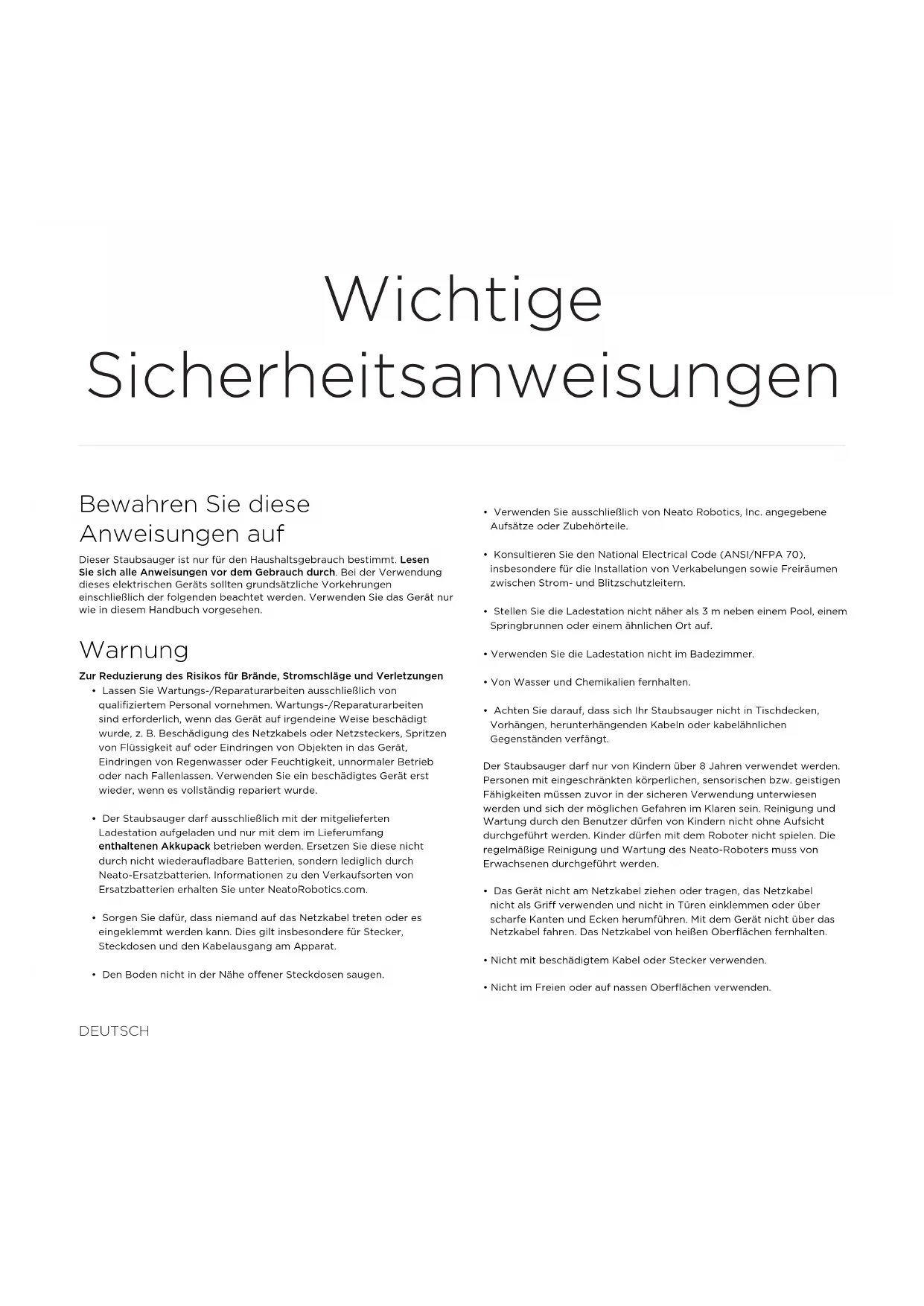 - Achten Sie darauf, dass sich Ihr Staubsauger nicht in Tischdecken, Vorhängen, herunterhängenden Kabeln oder kabelähnlichen Gegenständen verfängt. Der Staubsauger darf nur von Kindern über 8Jahren verwendet werden. Personen mit eingeschränkten körperlichen, sensorischen bzw. geistigen Fähigkeiten müssen zuvor in der sicheren Verwendung unterwiesen werden und sich der möglichen Gefahren im Klaren sein. Reinigung und Wartung durch den Benutzer dürfen von Kindern nicht ohne Aufsicht durchgeführt werden. Kinder dürfen mit dem Roboter nicht spielen. Die regelmäßige Reinigung und Wartung des Neato-Roboters muss von Erwachsenen durchgeführt werden.