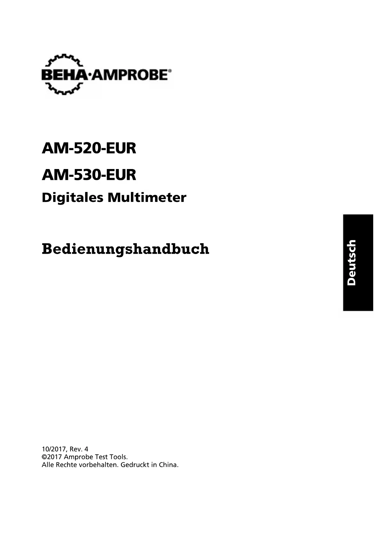 Pile 9 V F2Deutsch AM-520-EUR AM-530-EUR Digitales Multimeter Bedienungshandbuch 10/2017, Rev. 4 ©2017 Amprobe Test Tools. Alle Rechte vorbehalten. Gedruckt in China.Beschränkte Gewährleistung und Haftungsbeschränkung Es wird gewährleistet, dass dieses Amprobe-Produkt für die Dauer von einem Jahr ab dem Kaufdatum frei von Material- und Fertigungsdefekten ist, sofern örtliche Gesetze nichts anderes vorsehen. Diese Gewährleistung erstreckt sich nicht auf Sicherungen, Einwegbatterien oder Schäden durch Unfälle, Nachlässigkeit, Missbrauch, Änderungen oder abnormale Betriebsbedingungen bzw. unsachgemäße Handhabung. Die Verkaufsstellen sind nicht dazu berechtigt, diese Gewährleistung im Namen von Amprobe zu erweitern. Um während der Gewährleistungsperiode Serviceleistungen in Anspruch zu nehmen, das Produkt mit Kaufnachweis an ein autorisiertes Amprobe Service-Center oder an einen Amprobe- Fachhändler/-Distributor einsenden. Nähere Einzelheiten siehe Abschnitt „Reparatur“. DIESE GEWÄHRLEISTUNG STELLT DEN EINZIGEN UND ALLEINIGEN RECHTSANSPRUCH AUF SCHADENERSATZ DAR. ALLE ANDEREN (VERTRAGLICH GEREGELTEN ODER GESETZLICH