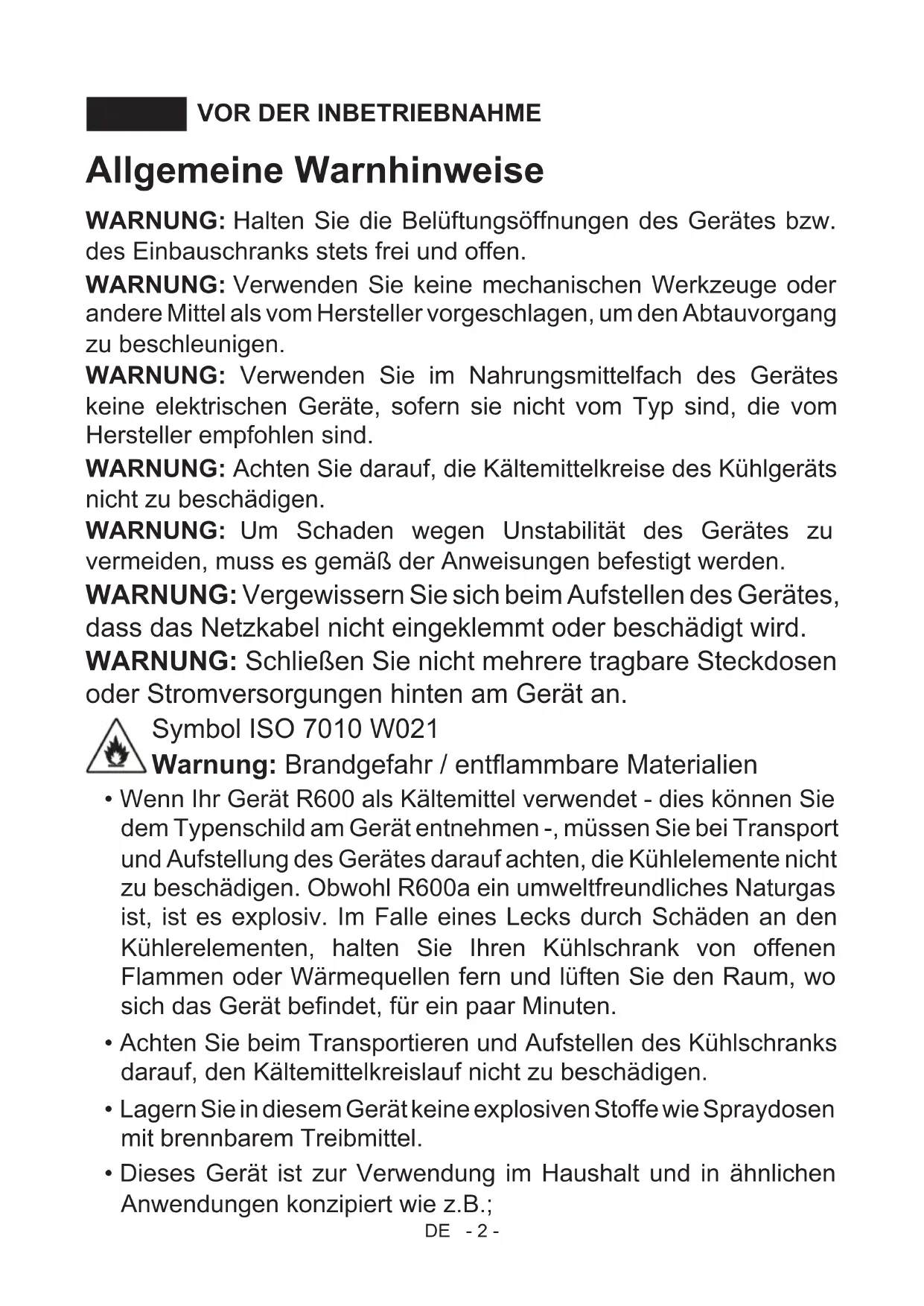 - Die Bedienungsanleitung gilt für verschiedene Modelle. Deshalb können Unterschiede auftreten.DE - 2 - VOR DER INBETRIEBNAHMETEIL 1. Allgemeine Warnhinweise WARNUNG: Halten Sie die Belüftungsöffnungen des Gerätes bzw. des Einbauschranks stets frei und offen. WARNUNG: Verwenden Sie keine mechanischen Werkzeuge oder andere Mittel als vom Hersteller vorgeschlagen, um den Abtauvorgang zu beschleunigen. WARNUNG: Verwenden Sie im Nahrungsmittelfach des Gerätes keine elektrischen Geräte, sofern sie nicht vom Typ sind, die vom Hersteller empfohlen sind. WARNUNG: Achten Sie darauf, die Kältemittelkreise des Kühlgeräts nicht zu beschädigen. WARNUNG: Um Schaden wegen Unstabilität des Gerätes zu vermeiden, muss es gemäß der Anweisungen befestigt werden. WARNUNG: Vergewissern Sie sich beim Aufstellen des Gerätes, dass das Netzkabel nicht eingeklemmt oder beschädigt wird. WARNUNG: Schließen Sie nicht mehrere tragbare Steckdosen oder Stromversorgungen hinten am Gerät an. Symbol ISO 7010 W021 Warnung: Brandgefahr / entammbare Materialien