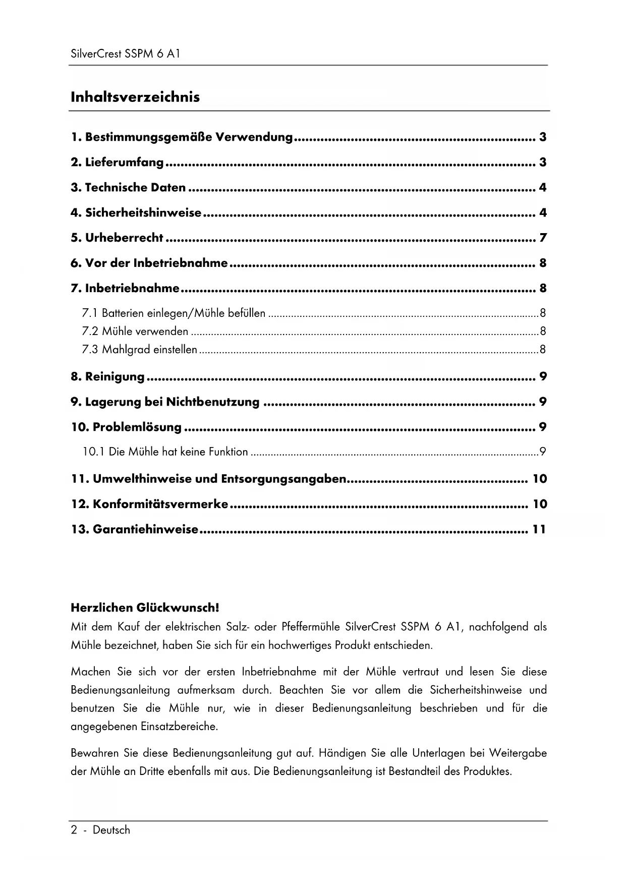 Herzlichen Glückwunsch! Mit dem Kauf der elektrischen Salz- oder Pfeffermühle SilverCrest SSPM 6 A1, nachfolgend als Mühle bezeichnet, haben Sie sich für ein hochwertiges Produkt entschieden. Machen Sie sich vor der ersten Inbetriebnahme mit der Mühle vertraut und lesen Sie diese Bedienungsanleitung aufmerksam durch. Beachten Sie vor allem die Sicherheitshinweise und benutzen Sie die Mühle nur, wie in dieser Bedienungsanleitung beschrieben und für die angegebenen Einsatzbereiche. Bewahren Sie diese Bedienungsanleitung gut auf. Händigen Sie alle Unterlagen bei Weitergabe der Mühle an Dritte ebenfalls mit aus. Die Bedienungsanleitung ist Bestandteil des Produktes.SilverCrest SSPM 6 A1 Deutsch - 3