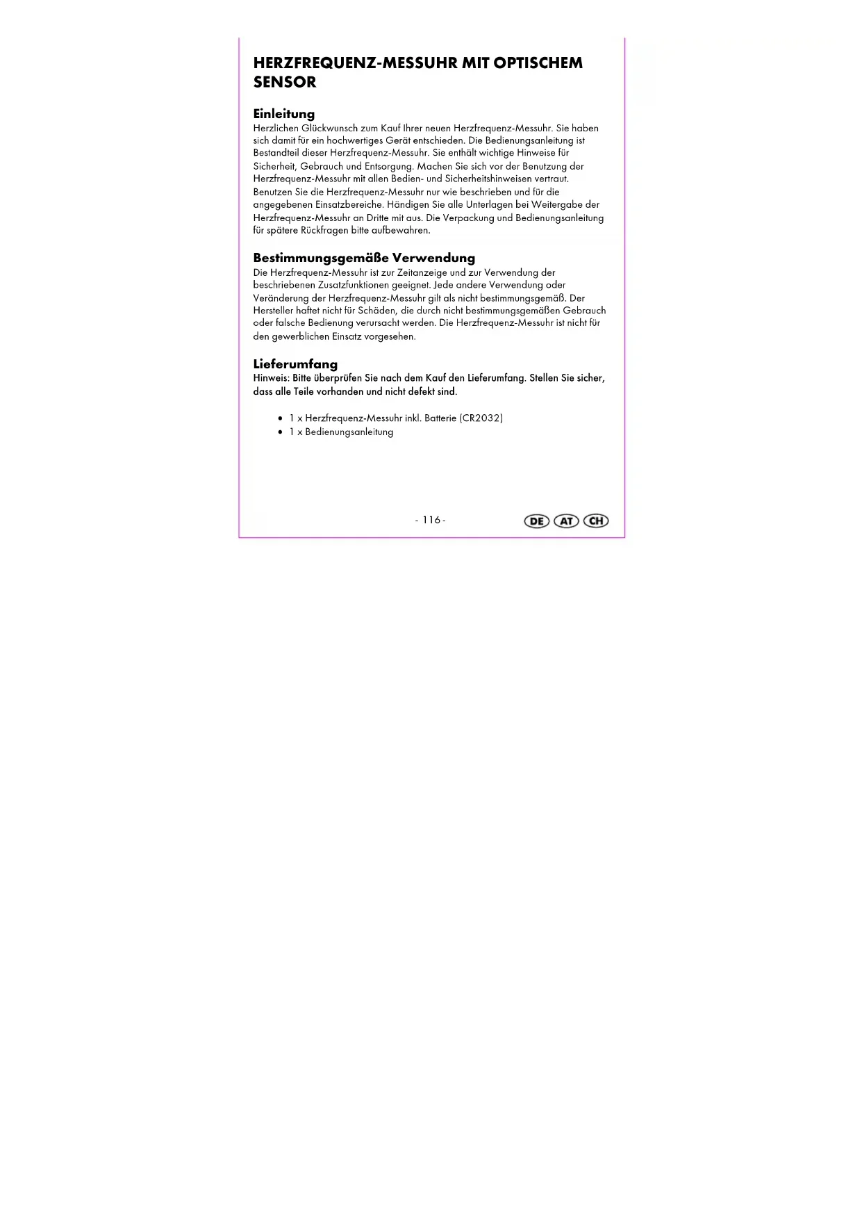 Reinigungshinweis Reinigen Sie die Herzfrequenz-Messuhr nur mit einem trockenen, fusselfreien Tuch, wie es z. B. zur Reinigung von Brillengläsern verwendet wird. Nach jedem Tragen reinigen Sie das Uhrenarmband mit lauwarmen Wasser oder einer milden Seifenwasserlösung und einem Schwamm. Achten Sie darauf, dass die Herzfrequenz-Messuhr dabei nicht nass wird. Trocknen Sie alle Teile mit einem Tuch ab. Schweiß und Verunreinigungen beeinträchtigen die Funktion des Sensors. Entsorgung der Herzfrequenz-Messuhr Diese Herzfrequenz-Messuhr darf nicht im normalen Hausmüll entsorgt werden. Entsorgen Sie die Herzfrequenz-Messuhr über einen zugelassenen Entsorgungsbetrieb oder über Ihre kommunale Entsorgungseinrichtung. Beachten Sie die aktuell geltenden Vorschriften. Setzen Sie sich im Zweifelsfall mit Ihrer Entsorgungseinrichtung in Verbindung. Entsorgung der Batterien Bitte entsorgen Sie Ihre Batterien sachgerecht in extra hierfür aufgestellten Gefäßen im Handel. Batterien gehören nicht in den Hausmüll. Entsorgen Sie Batterien bitte über einen zugelassenen Entsorgungsbetrieb oder über Ihre kommunale Entsorgungseinrichtung. Beachten Sie die aktuell geltenden Vorschriften. Setzen Sie sich im Zweifelsfall mit Ihrer Entsorgungseinrichtung in Verbindung.-