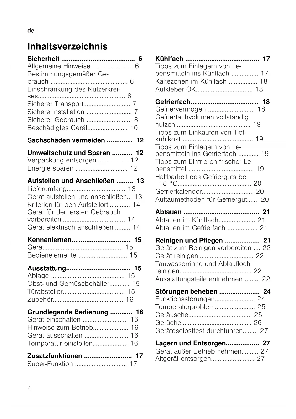 Sicherheit Beachten Sie die Informationen zum Thema Sicherheit, um Ihr Ge- rät sicher gebrauchen zu können. Allgemeine Hinweise Hier finden Sie allgemeine Informationen zu dieser Anleitung. ¡ Lesen Sie diese Anleitung sorgfältig. Nur dann können Sie das Gerät sicher und effizient verwenden. ¡ Diese Anleitung richtet sich an den Benutzer des Geräts. ¡ Beachten Sie die Sicherheitshinweise und die Warnhinweise. ¡ Bewahren Sie die Anleitung sowie die Produktinformationen für einen späteren Gebrauch oder Nachbesitzer auf. ¡ Prüfen Sie das Gerät nach dem Auspacken. Schließen Sie das Gerät bei einem Transportschaden nicht an. Bestimmungsgemäßer Gebrauch Um das Gerät sicher und richtig zu verwenden, beachten Sie die Hinweise zum bestimmungsgemäßen Gebrauch. Dieses Gerät ist nur für den Einbau bestimmt. Verwenden Sie das Gerät nur: ¡ gemäß dieser Gebrauchsanleitung. ¡ um Lebensmitteln zu kühlen und zu gefrieren und zur Eisberei- tung. ¡ im privaten Haushalt und in geschlossenen Räumen des häusli- chen Umfelds. ¡ bis zu einer Höhe von 2000m über dem Meeresspiegel. Einschränkung des Nutzerkreises Vermeiden Sie Risiken für Kinder und gefährdete Personen. Dieses Gerät kann von Kindern ab 8 Jahren und darüber und von Personen mit reduzierten physischen, sensorischen oder menta- len Fähigkeiten oder Mangel an Erfahrung und/oder Wissen be- nutzt werden, wenn sie beaufsichtigt oder bezüglich des sicheren Gebrauchs des Geräts unterwiesen wurden und die daraus resul- tierenden Gefahren verstanden haben.Sicherheit de