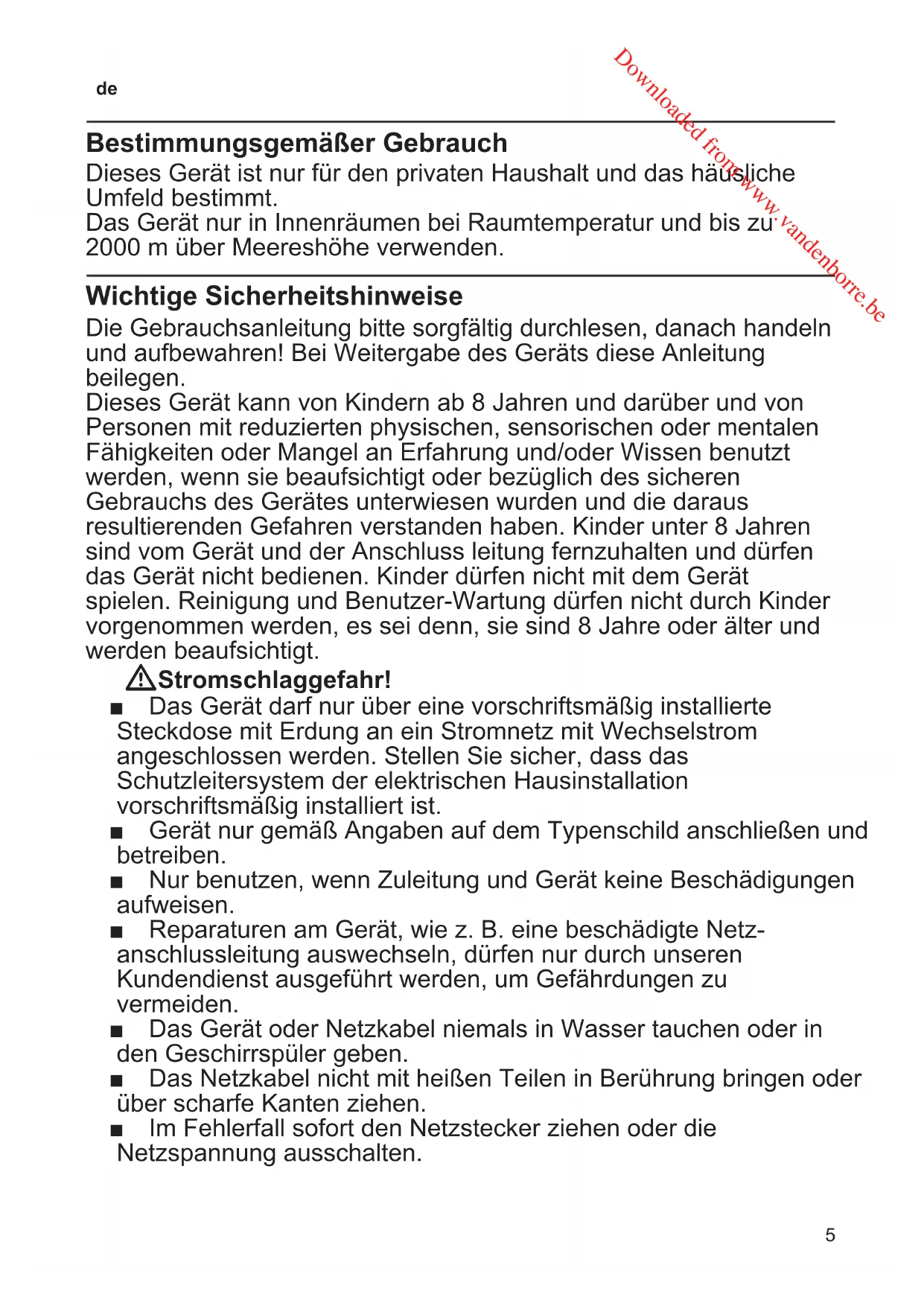 Bestimmungsgemäßer Gebrauch Dieses Gerät ist nur für den privaten Haushalt und das häusliche Umfeld bestimmt. Das Gerät nur in Innenräumen bei Raumtemperatur und bis zu 2000 m über Meereshöhe verwenden. Wichtige Sicherheitshinweise Die Gebrauchsanleitung bitte sorgfältig durchlesen, danach handeln und aufbewahren! Bei Weitergabe des Geräts diese Anleitung beilegen. Dieses Gerät kann von Kindern ab 8 Jahren und darüber und von Personen mit reduzierten physischen, sensorischen oder mentalen Fähigkeiten oder Mangel an Erfahrung und/oder Wissen benutzt werden, wenn sie beaufsichtigt oder bezüglich des sicheren Gebrauchs des Gerätes unterwiesen wurden und die daraus resultierenden Gefahren verstanden haben. Kinder unter 8 Jahren sind vom Gerät und der Anschluss leitung fernzuhalten und dürfen das Gerät nicht bedienen. Kinder dürfen nicht mit dem Gerät spielen. Reinigung und Benutzer-Wartung dürfen nicht durch Kinder vorgenommen werden, es sei denn, sie sind 8 Jahre oder älter und werden beaufsichtigt. W Stromschlaggefahr! ■ Das Gerät darf nur über eine vorschriftsmäßig installierte Steckdose mit Erdung an ein Stromnetz mit Wechselstrom angeschlossen werden. Stellen Sie sicher, dass das Schutzleitersystem der elektrischen Hausinstallation vorschriftsmäßig installiert ist. ■ Gerät nur gemäß Angaben auf dem Typenschild anschließen und betreiben. ■ Nur benutzen, wenn Zuleitung und Gerät keine Beschädigungen aufweisen. ■ Reparaturen am Gerät, wie z. B. eine beschädigte Netz- anschlussleitung auswechseln, dürfen nur durch unseren Kundendienst ausgeführt werden, um Gefährdungen zu vermeiden. ■ Das Gerät oder Netzkabel niemals in Wasser tauchen oder in den Geschirrspüler geben. ■ Das Netzkabel nicht mit heißen Teilen in Berührung bringen oder über scharfe Kanten ziehen. ■ Im Fehlerfall sofort den Netzstecker ziehen oder die Netzspannung ausschalten. Downloaded from www.vandenborre.be6