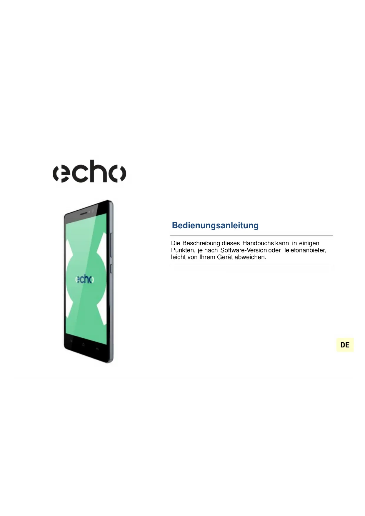 - Retirar la batería de tu teléfono (en caso de que ésta sea extraíble), en la parte posterior encontrarás una etiqueta con tu código IMEI. (Para las baterías no extraíbles, consulta la etiqueta en la partetrasera del teléfono) ATENCIÓ El desgaste por uso normal del producto (baterías, pantallas, teclados, objetivos de cámara de fotos) no está cubiertopor la garantía ECHO. Consejos para reducir el nivel de exposición: Para disminuir la cantidad de radiación recibida, te recomendamos que utilices tu teléfono en buenas condiciones de recepción. Se aconseja limitar su utilización principalmente en : parkings subterráneos o al desplazarse en coche,tren, etc. Las condiciones de recepción se visualizan en el teléfono mediante un conjunto de barras verticales. Cuantas más barras se muestran, mejor es la calidad de la recepción. Para limitar la exposición a la radiación, te recomen- damos la utilización de un kit de manos libres.Reciclaje En el presente manual, el símbolo del contenedor tachado indica que el producto está sometido a una directiva europea, la 2002/96/EC : los productos eléctricos o electrónicos, las baterías, los acumuladores y otros accesorios necesariamente han de ser objeto de una recogida selectiva. Al final de la vida útil del teléfono, haz uso de los contenedores de reciclaje o llévalo a una tienda de teléfonos móviles. Este gesto ayudará a reducir los riesgos para la salud y a preservar el medioambiente. Los ayuntamientos, los distribuidores y las asociaciones nacionales de constructores te aportarán las precisiones esenciales en materia de eliminación de su antiguo aparato.DECLARACIÓN DE CONFORMIDAD El abajo firmante, Modelabs Mobiles SAS con sede social en 107, rue de la Boétie - 75008 Pari s - FRANCIA, declara por la presente que el teléfono móvil Note cumple las normas y disposiciones de las directivas. El procedimiento de declaración de conformidad, definido en el artículo 10.5 de la directiva 1999/5/EC, se ha llevado a cabo con la supervisión del siguiente organismo: Intertek Testing & Certification Limited El texto íntegrode la Declaración de Conformidad del aparato puedeobtenerse en https://www.echomobiles.com/assistance/ La escucha prolongada a fuerte potenciaa través de cascos o auriculares puede provocar daños en la audición 0359Bedienungsanleitung Die Beschreibung dieses Handbuchs kann in einigen Punkten, je nach Software-Version oder Telefonanbieter, leicht von Ihrem Gerät abweichen.HERZLICHEN GLÜCKWUNSCH ! Hinweis Dieses Handbuch wurde mit größter Sorgfalt erstellt und hat zum Ziel, Sie bei der Benutzung dieses Geräts anzuleiten. Die hierin enthaltenen Informationen und Empfehlungen unterliegen nach anwendbarem Recht keiner Garantie. ECHO behält sich das Recht vor, die in diesem Handbuch aufgeführten Informationen zu verändern. Herzlichen Glückwunsch zum Kauf Ihres Mobiltele- fons Echo Note In dieser Anleitung finden Sie alle notwendigen Informationen zur Benutzung des Mobiltelefons, um sich möglichst schnell mit dem ECHO-Umfeld vertraut machen zu können. Haftungsbeschränkung Alle über dieses Gerät verfügbaren Dienstleistungen und Inhalte sind ausschließliches Eigentum Dritter und folglich gesetzlich geschützt (Urheberrechte, Pa- tente, Lizenzen und andere gesetzliche Regelungen zum Schutz geistigen Eigentums). Diese Dienstleis- tungen sind auf Ihre persönliche Nutzung beschränkt und dürfen nicht für gewerbliche Zwecke verwendet werden. Es ist nicht möglich, diese Dienstleistungen oder Inhalte ohne eine vorherige schriftliche Anfrage beim Eigentümer des Inhalts zu benutzen. Sie haben keinesfalls das Recht, die durchdieses Gerät zur Verfügung Copyright©2015 ECHO Die in diesem Handbuch enthaltenen Informationen dürfen unter keinen Umständen in irgendeiner Form weiterverbreitet oder reproduziert werden, es sei denn mit ausdrücklicher Genehmigungvon ECHO. Handelsmarken ECHO ist eine eingetragene Marke der Modelabs Mobiles SAS.gestellten Dienstleistungenoder Inhalte auf irgendeine Weise und mithilfe irgendeines Mediums zu kopieren, zu veröffentlichen, zu übertragen, zu ver- kaufen oder geschäftlich zu nutzen oder von ihnen abgeleitete Versionen zu erstellen. ECHO verfügt über keinerlei Kontrolle über die Inhalte und Dienstleistungen, die von Dritten über Netzwerke oder andere Übertragungswege übertragen werden. Außerdem können die Dienstleistungen Dritter jederzeit unterbrochen oder gekündigt werden. Aus diesem Grund leistet ECHO keine Vertretung oder Garantie hinsichtlich der Verfügbarkeit aller Inhalte und Dienstleistungen Dritter und übernimmt hinsichtlich einer solchen Unterbrechung oder Aussetzung keinerlei Haftung.