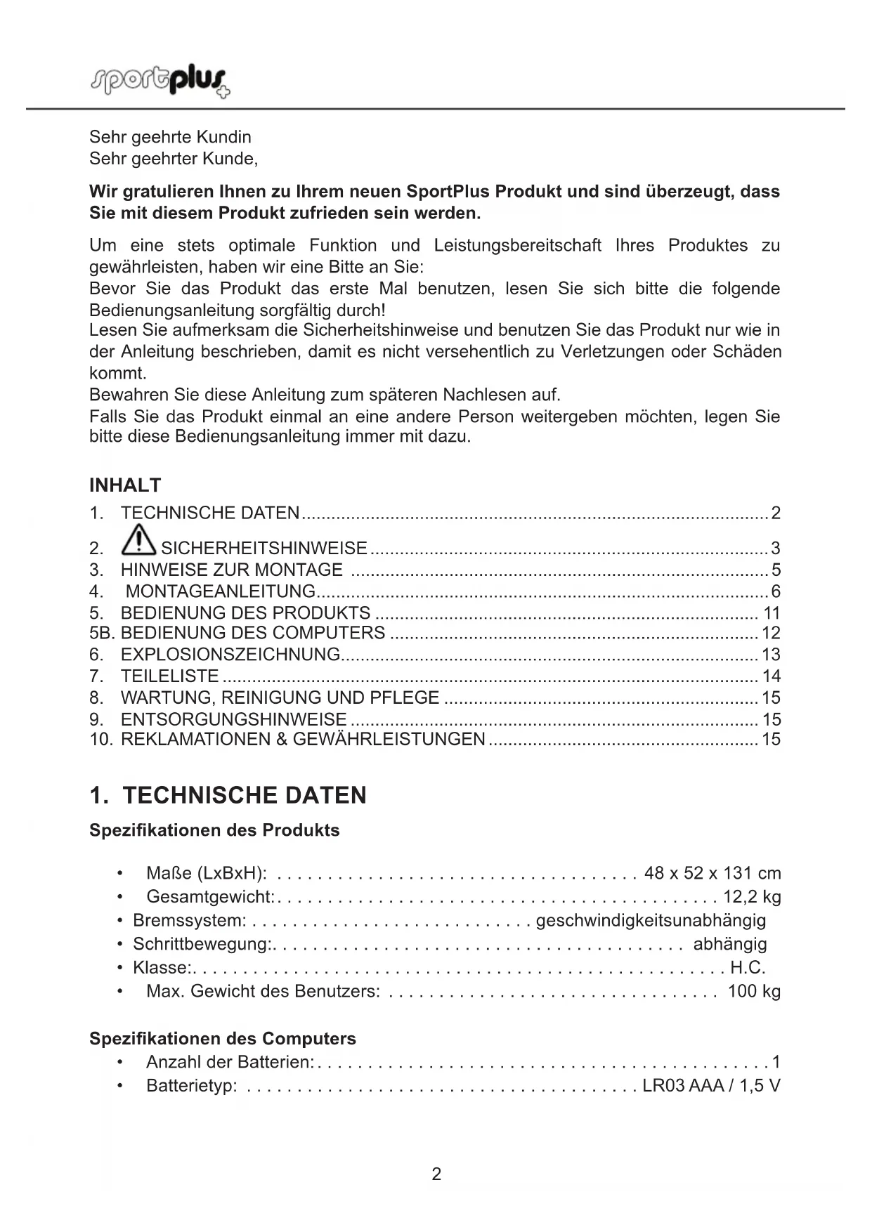 SP-MSP-008-B-IM-DE+GB+FR-01.indb 1 18/4/2016 4:27 PM2 Sehr geehrte Kundin Sehr geehrter Kunde, Wir gratulieren Ihnen zu Ihrem neuen SportPlus Produkt und sind überzeugt, dass Sie mit diesem Produkt zufrieden sein werden. Um eine stets optimale Funktion und Leistungsbereitschaft Ihres Produktes zu gewährleisten, haben wir eine Bitte an Sie: Bevor Sie das Produkt das erste Mal benutzen, lesen Sie sich bitte die folgende Bedienungsanleitung sorgfältig durch! Lesen Sie aufmerksam die Sicherheitshinweise und benutzen Sie das Produkt nur wie in der Anleitung beschrieben, damit es nicht versehentlich zu Verletzungen oder Schäden kommt. Bewahren Sie diese Anleitung zum späteren Nachlesen auf. Falls Sie das Produkt einmal an eine andere Person weitergeben möchten, legen Sie bitte diese Bedienungsanleitung immer mit dazu. INHALT