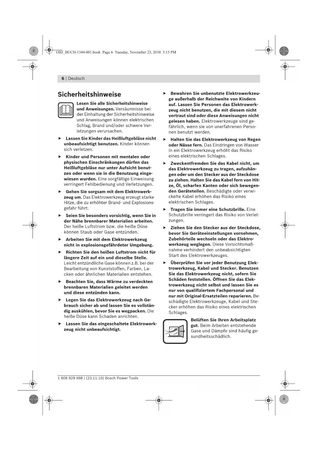 Sicherheitshinweise Lesen Sie alle Sicherheitshinweise und Anweisungen. Versäumnisse bei der Einhaltung der Sicherheitshinweise und Anweisungen können elektrischen Schlag, Brand und/oder schwere Ver- letzungen verursachen. f Lassen Sie Kinder das Heißluftgebläse nicht unbeaufsichtigt benutzen. Kinder können sich verletzen. f Kinder und Personen mit mentalen oder physischen Einschränkungen dürfen das Heißluftgebläse nur unter Aufsicht benut- zen oder wenn sie in die Benutzung einge- wiesen wurden. Eine sorgfältige Einweisung verringert Fehlbedienung und Verletzungen. f Gehen Sie sorgsam mit dem Elektrowerk- zeug um. Das Elektrowerkzeug erzeugt starke Hitze, die zu erhöhter Brand- und Explosions- gefahr führt. f Seien Sie besonders vorsichtig, wenn Sie in der Nähe brennbarer Materialien arbeiten. Der heiße Luftstrom bzw. die heiße Düse können Staub oder Gase entzünden. f Arbeiten Sie mit dem Elektrowerkzeug nicht in explosionsgefährdeter Umgebung. f Richten Sie den heißen Luftstrom nicht für längere Zeit auf ein und dieselbe Stelle. Leicht entzündliche Gase können z.B. bei der Bearbeitung von Kunststoffen, Farben, La- cken oder ähnlichen Materialien entstehen. f Beachten Sie, dass Wärme zu verdeckten brennbaren Materialien geleitet werden und diese entzünden kann. f Legen Sie das Elektrowerkzeug nach Ge- brauch sicher ab und lassen Sie es vollstän- dig auskühlen, bevor Sie es wegpacken. Die heiße Düse kann Schaden anrichten. f Lassen Sie das eingeschaltete Elektrowerk- zeug nicht unbeaufsichtigt. f Bewahren Sie unbenutzte Elektrowerkzeu- ge außerhalb der Reichweite von Kindern auf. Lassen Sie Personen das Elektrowerk- zeug nicht benutzen, die mit diesem nicht vertraut sind oder diese Anweisungen nicht gelesen haben. Elektrowerkzeuge sind ge- fährlich, wenn sie von unerfahrenen Perso- nen benutzt werden. f Halten Sie das Elektrowerkzeug von Regen oder Nässe fern. Das Eindringen von Wasser in ein Elektrowerkzeug erhöht das Risiko eines elektrischen Schlages. f Zweckentfremden Sie das Kabel nicht, um das Elektrowerkzeug zu tragen, aufzuhän- gen oder um den Stecker aus der Steckdose zu ziehen. Halten Sie das Kabel fern von Hit- ze, Öl, scharfen Kanten oder sich bewegen- den Geräteteilen. Beschädigte oder verwi- ckelte Kabel erhöhen das Risiko eines elektrischen Schlages. f Tragen Sie immer eine Schutzbrille. Eine Schutzbrille verringert das Risiko von Verlet- zungen. f Ziehen Sie den Stecker aus der Steckdose, bevor Sie Geräteeinstellungen vornehmen, Zubehörteile wechseln oder das Elektro- werkzeug weglegen. Diese Vorsichtsmaß- nahme verhindert den unbeabsichtigten Start des Elektrowerkzeuges. f Überprüfen Sie vor jeder Benutzung Elek- trowerkzeug, Kabel und Stecker. Benutzen Sie das Elektrowerkzeug nicht, sofern Sie Schäden feststellen. Öffnen Sie das Elek- trowerkzeug nicht selbst und lassen Sie es nur von qualifiziertem Fachpersonal und nur mit Original-Ersatzteilen reparieren. Be- schädigte Elektrowerkzeuge, Kabel und Ste- cker erhöhen das Risiko eines elektrischen Schlages. Belüften Sie Ihren Arbeitsplatz gut. Beim Arbeiten entstehende Gase und Dämpfe sind häufig ge- sundheitsschädlich. OBJ_BUCH-1344-001.book Page 6 Tuesday, November 23, 2010 3:15 PMDeutsch | 7 Bosch Power Tools 1 609 929 X68 | (23.11.10) f Tragen Sie Schutzhandschuhe und berüh- ren Sie die heiße Düse nicht. Es besteht Ver- brennungsgefahr. f Richten Sie den heißen Luftstrom nicht auf Personen oder Tiere. f Verwenden Sie das Elektrowerkzeug nicht als Haartrockner. Der austretende Luftstrom ist wesentlich heißer als bei einem Haar- trockner. f Wenn der Betrieb des Elektrowerkzeugs in feuchter Umgebung nicht vermeidbar ist, verwenden Sie einen Fehlerstromschutz- schalter. Der Einsatz eines Fehlerstrom- schutzschalters vermindert das Risiko eines elektrischen Schlages. f Benutzen Sie das Elektrowerkzeug nicht mit beschädigtem Kabel. Berühren Sie das beschädigte Kabel nicht und ziehen Sie den Netzstecker, wenn das Kabel während des Arbeitens beschädigt wird. Beschädigte Kabel erhöhen das Risiko eines elektrischen Schlages. Funktionsbeschreibung Bitte klappen Sie die Aufklappseite mit der Dar- stellung des Elektrowerkzeugs auf, und lassen Sie diese Seite aufgeklappt, während Sie die Betriebsanleitung lesen. Bestimmungsgemäßer Gebrauch Das Elektrowerkzeug ist bestimmt zum Verfor- men und Verschweißen von Kunststoff, Entfer- nen von Farbanstrichen und zum Erwärmen von Schrumpfschläuchen. Es ist auch geeignet zum Löten und Verzinnen, Lösen von Klebeverbin- dungen und zum Auftauen von Wasserleitungen. Abgebildete Komponenten Die Nummerierung der abgebildeten Kompo- nenten bezieht sich auf die Darstellung des Elek- trowerkzeuges auf der Grafikseite. 1 Düse 2 Wärmeschutz 3 Ablagefläche 4 Ein-/Ausschalter mit Luftmengen- und Temperaturregler (GHG 500-2/GHG 600-3) 5 Ein-/Ausschalter mit Luftmengenregler (GHG 630 DCE) 6 Taste für Temperaturregulierung (GHG 630 DCE) 7 Display (GHG 630 DCE) 8 Flächendüse* 9 Glasschutzdüse* 10 Reflektordüse* 11 Schweißdraht* 12 Schweißschuh* 13 Reduzierdüse* 14 Schrumpfschlauch* 15 Winkeldüse* *Abgebildetes oder beschriebenes Zubehör gehört nicht zum Standard-Lieferumfang. Das vollständige Zubehör finden Sie in unserem Zubehörprogramm. Geräuschinformation Messwerte für Geräusch ermittelt entsprechend EN 60745. Der A-bewertete Schalldruckpegel des Elektro- werkzeugs ist typischerweise kleiner als 70 dB(A). OBJ_BUCH-1344-001.book Page 7 Tuesday, November 23, 2010 3:15 PM8 | Deutsch 1 609 929 X68 | (23.11.10) Bosch Power Tools Technische Daten Betrieb Inbetriebnahme f Beachten Sie die Netzspannung! Die Span- nung der Stromquelle muss mit den Angaben auf dem Typenschild des Elektrowerkzeuges übereinstimmen. Mit 230 V gekennzeichnete Elektrowerkzeuge können auch an 220 V betrieben werden. Einschalten GHG 500-2: Drücken Sie den Ein-/Ausschalter 4 in Stellung I oder II. GHG 600-3: Drücken Sie den Ein-/Ausschalter 4 i