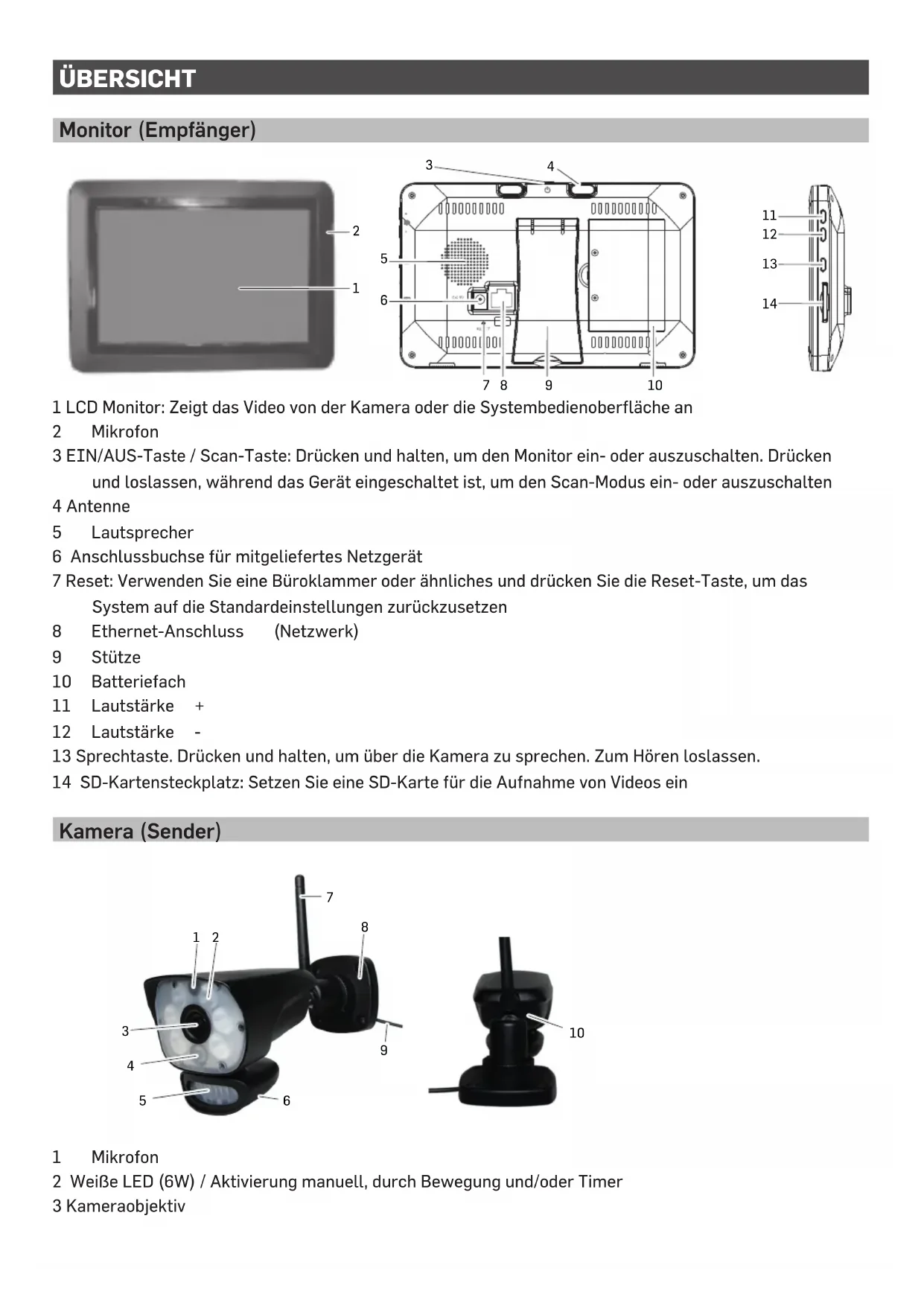 DEUTSCH ENGLISH FRANÇAIS ITALIANO HSIP 6000 Home Monitoring HD Digital Surveillance Monitor Please read carefully before using this equipment. Bedienungsanleitung User‘s Manual Manuel de l‘utilisateur Manual del UsuarioÜBERSICHT Monitor (Empfänger) 1 LCD Monitor: Zeigt das Video von der Kamera oder die Systembedienoberfläche an 2 Mikrofon 3 EIN/AUS-Taste / Scan-Taste: Drücken und halten, um den Monitor ein- oder auszuschalten. Drücken und loslassen, während das Gerät eingeschaltet ist, um den Scan-Modus ein- oder auszuschalten 4 Antenne 5 Lautsprecher 6 Anschlussbuchse für mitgeliefertes Netzgerät 7 Reset: Verwenden Sie eine Büroklammer oder ähnliches und drücken Sie die Reset-Taste, um das System auf die Standardeinstellungen zurückzusetzen 8 Ethernet-Anschluss (Netzwerk) 9 Stütze 10 Batteriefach 11 Lautstärke + 12 Lautstärke - 13 Sprechtaste. Drücken und halten, um über die Kamera zu sprechen. Zum Hören loslassen. 14 SD-Kartensteckplatz: Setzen Sie eine SD-Karte für die Aufnahme von Videos ein Kamera (Sender) 1 Mikrofon 2 Weiße LED (6W) / Aktivierung manuell, durch Bewegung und/oder Timer 3 Kameraobjektiv