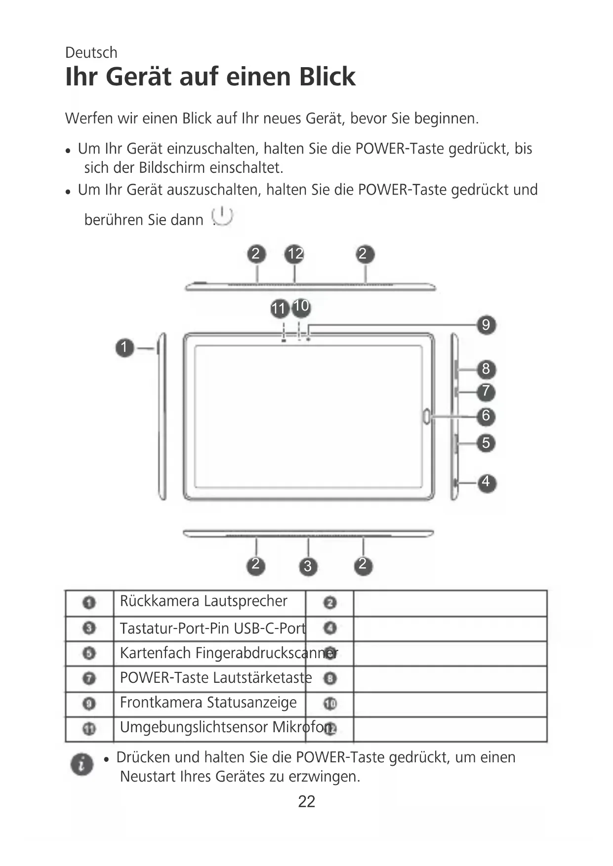 veuillez consulter le site Web www.energystar.gov. Politique de condentialité Pour mieux comprendre comment nous protégeons vos informations personnelles, consultez la politique de condentialité sur http:// consumer.huawei.com/privacy-policy. Copyright © Huawei Technologies Co., Ltd. 2018. Tous droits réservés. CE DOCUMENT EST FOURNI À TITRE INFORMATIF UNIQUEMENT. IL NE CONSTITUE EN AUCUN CAS UNE FORME DE GARANTIE. 21Ihr Gerät auf einen Blick Werfen wir einen Blick auf Ihr neues Gerät, bevor Sie beginnen. l Um Ihr Gerät einzuschalten, halten Sie die POWER-Taste gedrückt, bis sich der Bildschirm einschaltet. l Um Ihr Gerät auszuschalten, halten Sie die POWER-Taste gedrückt und berühren Sie dann .