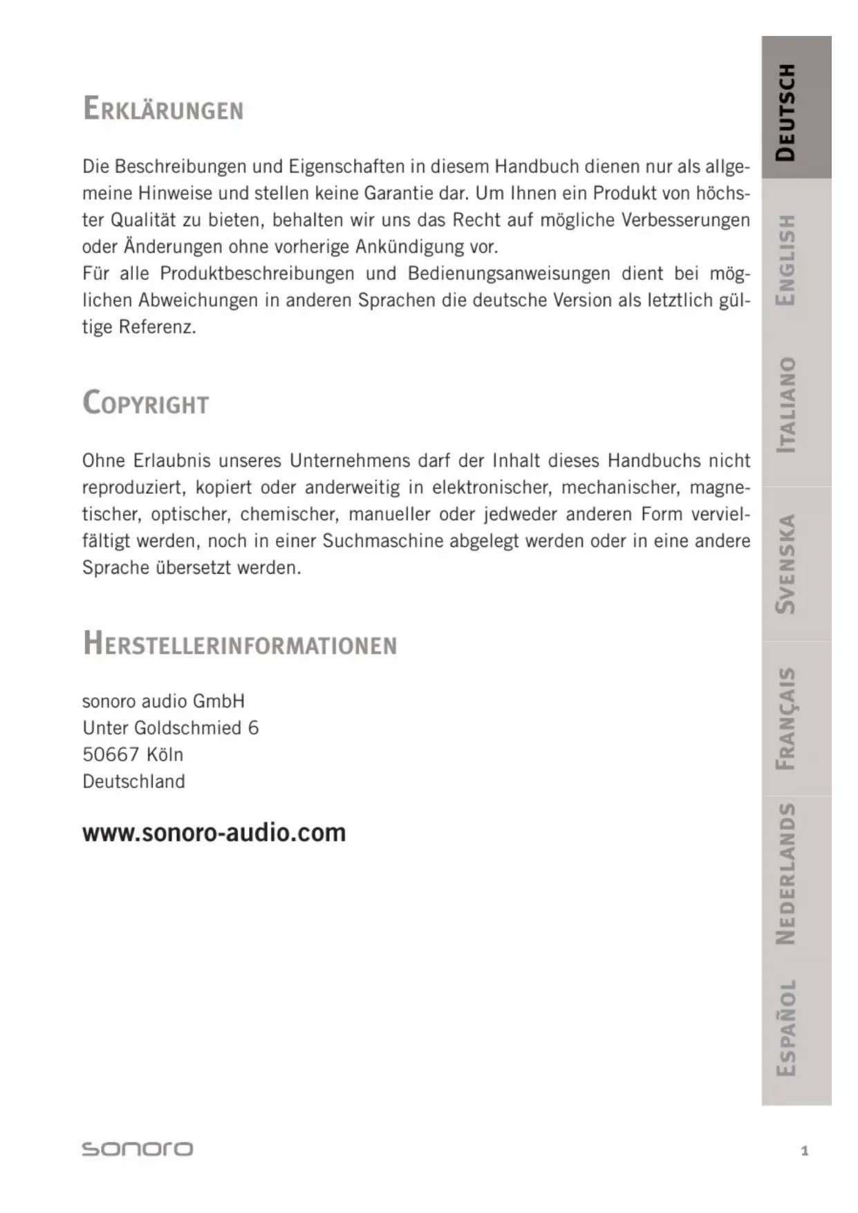 cover_elements_AU-4000.indd 1 20.10.2008 16:24:39Manual_Cubo_AU-4000_ES.indd 24 20.10.2008 00:51:061 Svenska Nederlands Français Italiano Deutsch English Español ERKLÄRUNGEN Die Beschreibungen und Eigenschaften in diesem Handbuch dienen nur als allge- meine Hinweise und stellen keine Garantie dar. Um Ihnen ein Produkt von höchs- ter Qualität zu bieten, behalten wir uns das Recht auf mögliche Verbesserungen oder Änderungen ohne vorherige Ankündigung vor. Für alle Produktbeschreibungen und Bedienungsanweisungen dient bei mög- lichen Abweichungen in anderen Sprachen die deutsche Version als letztlich gül- tige Referenz. COPYRIGHT Ohne Erlaubnis unseres Unternehmens darf der Inhalt dieses Handbuchs nicht reproduziert, kopiert oder anderweitig in elektronischer, mechanischer, magne- tischer, optischer, chemischer, manueller oder jedweder anderen Form verviel- fältigt werden, noch in einer Suchmaschine abgelegt werden oder in eine andere Sprache übersetzt werden. HERSTELLERINFORMATIONEN sonoro audio GmbH & Co. KG Unter Goldschmied 6 50667 Köln Deutschland www.sonoro-audio.com Manual_Cubo_AU-4000_DE.indd 1 20.10.2008 00:49:432 INHALT