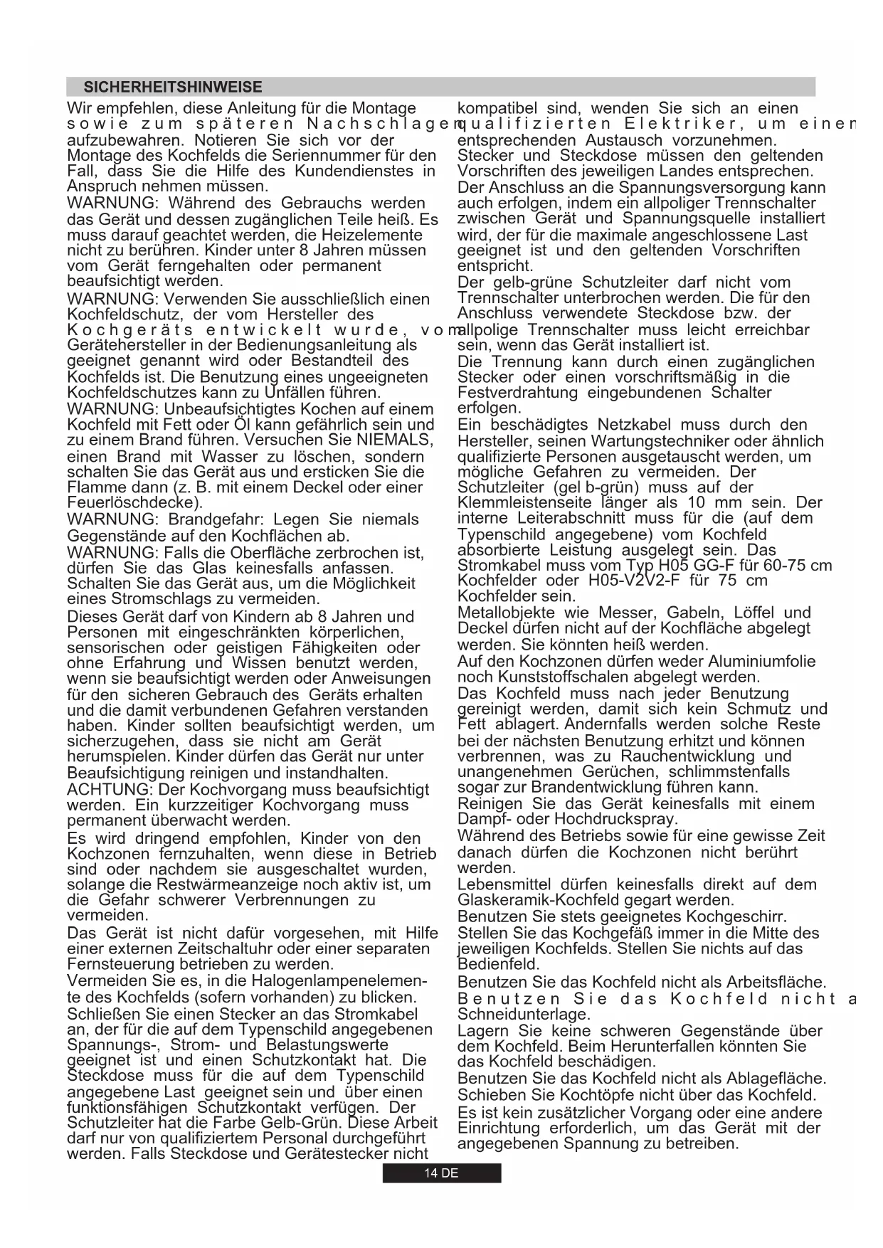 Die Installation eines Haushaltsgeräts kann unter Umständen eine komplexe Arbeit sein; wenn diese nicht korrekt ausgeführt wird, könnte es zu schweren Beeinträchtigungen der Sicherheit des Benutzers kommen. Das ist der Grund, warum sie von einem qualifizierten Fachmann unter Einhaltung der geltenden technischen Regeln durchgeführt werden soll. Falls diese Empfehlung nicht beachtet und die Installation des Gerätes durch eine nicht qualifizierte Person durchgeführt werden sollte, lehnt der Hersteller jede Verantwortung für eventuelle technische Fehler des Produktes ab, gleichviel, ob es zu Schäden an Personen oder Sachen führt. 2.1. ELEKTRISCHER ANSCHLUSS Überprüfen Sie die auf dem Matrikelschild angegebenen Daten. Das Matrikelschild befindet sich auf der unteren Seite des Gerätegehäuses. Notieren Sie alle Daten wie Matrikel- und Seriennummer am besten direkt auf dem Deckblatt der Bedienungsanleitung, da diese Angaben in einem eventuellen Servicefall vom Kundendienst benötigt werden. Überprüfen Sie, dass die Netzspannung und die Leistung für den Betrieb des Gerätes geeignet sind. Vor dem elektrischen Anschluss ist die einwandfreie Erdung der elektrischen Hausinstallation zu prüfen. Die Erdung des Gerätes ist gesetzlich vorgeschrieben. Der Hersteller weist jede Verantwortung für Sach- oder Personenschäden zurück, die auf fehlende bzw. mangelhafte Erdung zurückzuführen sind. Bei den Modellen, die ohne Stecker geliefert werden, ist ein genormter Stecker an das Kabel zu montieren, welcher für die auf das Matrikelschild angegebene Belastung geeignet ist. Der Erdleiter ist durch das gelb-grüne Kabel gekennzeichnet. Der Stecker muss in jedem Fall zugänglich sein. Soll das Gerät an einer festen Anschlussdose angeschlossen werden, ist zwischen dem Gerät und dem Versorgungsnetz eine der Last entsprechende, genormte Abschaltvorrichtung einzubauen. Sollte das Netzkabel beschädigt sein, muss dieser durch einen qualifizierten Fachmann ausgewechselt werden. Der gelb-grüne Erdleiter muss mindestens 10 mm länger sein als die Phasenleiter. Der Querschnitt der Kabel muss der Leistung der Kochmulde entsprechen (s. Matrikelschild). Benutzen Sie ausschließlich ein Netzkabel des Typs 3x0.75 mm² H05 GG-F für 60- 75 cm Kochfelder oder H05-V2V2-F für 75 cm Kochfelder. PHASE ERDE NULL