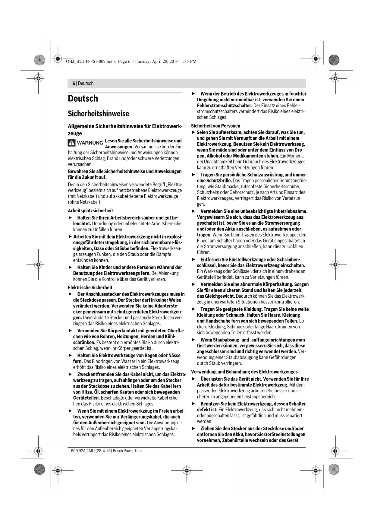 OBJ_BUCH-861-007.book Page 5 Thursday, April 28, 2016 1:35 PM6 | Deutsch 1 609 92A 2A6 | (28.4.16) Bosch Power Tools Deutsch Sicherheitshinweise Allgemeine Sicherheitshinweise für Elektrowerk- zeuge Lesen Sie alle Sicherheitshinweise und Anweisungen. Versäumnisse bei der Ein- haltung der Sicherheitshinweise und Anweisungen können elektrischen Schlag, Brand und/oder schwere Verletzungen verursachen. Bewahren Sie alle Sicherheitshinweise und Anweisungen für die Zukunft auf. Der in den Sicherheitshinweisen verwendete Begriff „Elektro- werkzeug“ bezieht sich auf netzbetriebene Elektrowerkzeuge (mit Netzkabel) und auf akkubetriebene Elektrowerkzeuge (ohne Netzkabel). Arbeitsplatzsicherheit Halten Sie Ihren Arbeitsbereich sauber und gut be- leuchtet. Unordnung oder unbeleuchtete Arbeitsbereiche können zu Unfällen führen. Arbeiten Sie mit dem Elektrowerkzeug nicht in explosi- onsgefährdeter Umgebung, in der sich brennbare Flüs- sigkeiten, Gase oder Stäube befinden. Elektrowerkzeu- ge erzeugen Funken, die den Staub oder die Dämpfe entzünden können. Halten Sie Kinder und andere Personen während der Benutzung des Elektrowerkzeugs fern. Bei Ablenkung können Sie die Kontrolle über das Gerät verlieren. Elektrische Sicherheit Der Anschlussstecker des Elektrowerkzeuges muss in die Steckdose passen. Der Stecker darf in keiner Weise verändert werden. Verwenden Sie keine Adapterste- cker gemeinsam mit schutzgeerdeten Elektrowerkzeu- gen. Unveränderte Stecker und passende Steckdosen ver- ringern das Risiko eines elektrischen Schlages. Vermeiden Sie Körperkontakt mit geerdeten Oberflä- chen wie von Rohren, Heizungen, Herden und Kühl- schränken. Es besteht ein erhöhtes Risiko durch elektri- schen Schlag, wenn Ihr Körper geerdet ist. Halten Sie Elektrowerkzeuge von Regen oder Nässe fern. Das Eindringen von Wasser in ein Elektrowerkzeug erhöht das Risiko eines elektrischen Schlages. Zweckentfremden Sie das Kabel nicht, um das Elektro- werkzeug zu tragen, aufzuhängen oder um den Stecker aus der Steckdose zu ziehen. Halten Sie das Kabel fern von Hitze, Öl, scharfen Kanten oder sich bewegenden Geräteteilen. Beschädigte oder verwickelte Kabel erhö- hen das Risiko eines elektrischen Schlages. Wenn Sie mit einem Elektrowerkzeug im Freien arbei- ten, verwenden Sie nur Verlängerungskabel, die auch für den Außenbereich geeignet sind. Die Anwendung ei- nes für den Außenbereich geeigneten Verlängerungska- bels verringert das Risiko eines elektrischen Schlages. Wenn der Betrieb des Elektrowerkzeuges in feuchter Umgebung nicht vermeidbar ist, verwenden Sie einen Fehlerstromschutzschalter. Der Einsatz eines Fehler- stromschutzschalters vermindert das Risiko eines elektri- schen Schlages. Sicherheit von Personen Seien Sie aufmerksam, achten Sie darauf, was Sie tun, und gehen Sie mit Vernunft an die Arbeit mit einem Elektrowerkzeug. Benutzen Sie kein Elektrowerkzeug, wenn Sie müde sind oder unter dem Einfluss von Dro- gen, Alkohol oder Medikamenten stehen. Ein Moment der Unachtsamkeit beim Gebrauch des Elektrowerkzeuges kann zu ernsthaften Verletzungen führen. Tragen Sie persönliche Schutzausrüstung und immer eine Schutzbrille. Das Tragen persönlicher Schutzausrüs- tung, wie Staubmaske, rutschfeste Sicherheitsschuhe, Schutzhelm oder Gehörschutz, je nach Art und Einsatz des Elektrowerkzeuges, verringert das Risiko von Verletzun- gen. Vermeiden Sie eine unbeabsichtigte Inbetriebnahme. Vergewissern Sie sich, dass das Elektrowerkzeug aus- geschaltet ist, bevor Sie es an die Stromversorgung und/oder den Akku anschließen, es aufnehmen oder tragen. Wenn Sie beim Tragen des Elektrowerkzeuges den Finger am Schalter haben oder das Gerät eingeschaltet an die Stromversorgung anschließen, kann dies zu Unfällen führen. Entfernen Sie Einstellwerkzeuge oder Schrauben- schlüssel, bevor Sie das Elektrowerkzeug einschalten. Ein Werkzeug oder Schlüssel, de r sich in einem drehenden Geräteteil befindet, kann zu Verletzungen führen. Vermeiden Sie eine abnormale Körperhaltung. Sorgen Sie für einen sicheren Stand und halten Sie jederzeit das Gleichgewicht. Dadurch können Sie das Elektrowerk- zeug in unerwarteten Situationen besser kontrollieren. Tragen Sie geeignete Kleidung. Tragen Sie keine weite Kleidung oder Schmuck. Halten Sie Haare, Kleidung und Handschuhe fern von sich bewegenden Teilen. Lo- ckere Kleidung, Schmuck oder lange Haare können von sich bewegenden Teilen erfasst werden. Wenn Staubabsaug- und -auffangeinrichtungen mon- tiert werden können, vergewissern Sie sich, dass diese angeschlossen sind und richtig verwendet werden. Ver- wendung einer Staubabsaugung kann Gefährdungen durch Staub verringern. Verwendung und Behandlung des Elektrowerkzeuges Überlasten Sie das Gerät nicht. Verwenden Sie für Ihre Arbeit das dafür bestimmte Elektrowerkzeug. Mit dem passenden Elektrowerkzeug arbeiten Sie besser und si- cherer im angegebenen Leistungsbereich. Benutzen Sie kein Elektrowerkzeug, dessen Schalter defekt ist. Ein Elektrowerkzeug, das sich nicht mehr ein- oder ausschalten lässt, ist gefährlich und muss repariert werden. Ziehen Sie den Stecker aus der Steckdose und/oder entfernen Sie den Akku, bevor Sie Geräteeinstellungen vornehmen, Zubehörteile wechseln oder das Gerät WARNUNG OBJ_BUCH-861-007.book Page 6 Thursday, April 28, 2016 1:35 PMDeutsch | 7 Bosch Power Tools 1 609 92A 2A6 | (28.4.16) weglegen. Diese Vorsichtsmaßnahme verhindert den un- beabsichtigten Start des Elektrowerkzeuges. Bewahren Sie unbenutzte Elektrowerkzeuge außer- halb der Reichweite von Kindern auf. Lassen Sie Perso- nen das Gerät nicht benutzen, die mit diesem nicht ver- traut sind oder diese Anweisungen nicht gelesen haben. Elektrowerkzeuge sind gefährlich, wenn sie von unerfahrenen Personen benutzt werden. Pflegen Sie Elektrowerkzeuge mit Sorgfalt. Kontrollie- ren Sie, ob bewegliche Teile einwandfrei funktionieren und nicht klemmen, ob Teile gebrochen oder so be- schädigt sind, dass die Funk