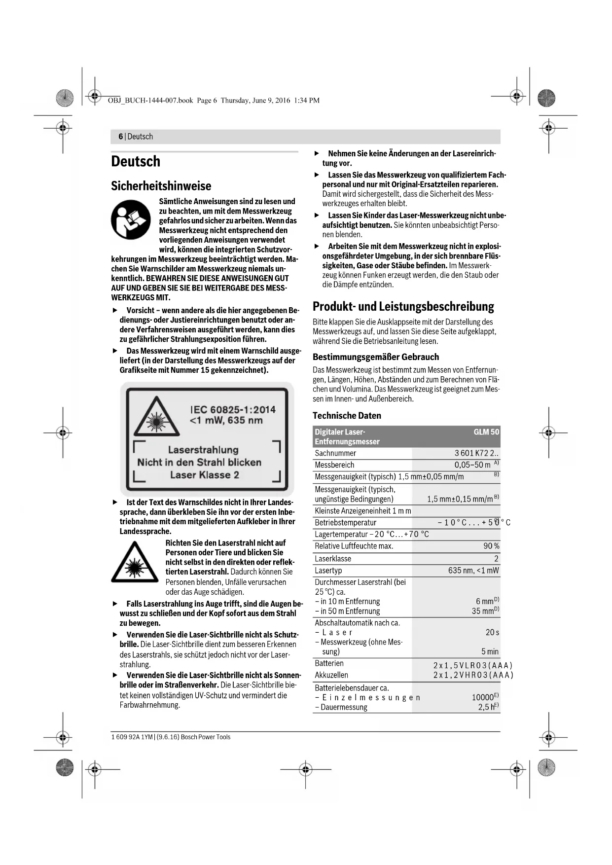 GLM 50 OBJ_BUCH-1444-007.book Page 4 Thursday, June 9, 2016 2:00 PM1 609 92A 1YM | (9.6.16) Bosch Power Tools 5 | OBJ_BUCH-1444-007.book Page 5 Thursday, June 9, 2016 1:34 PM6 | Deutsch 1 609 92A 1YM | (9.6.16) Bosch Power Tools Deutsch Sicherheitshinweise Sämtliche Anweisungen sind zu lesen und zu beachten, um mit dem Messwerkzeug gefahrlos und sicher zu arbeiten. Wenn das Messwerkzeug nicht entsprechend den vorliegenden Anweisungen verwendet wird, können die integrierten Schutzvor- kehrungen im Messwerkzeug beeinträchtigt werden. Ma- chen Sie Warnschilder am Messwerkzeug niemals un- kenntlich. BEWAHREN SIE DIESE ANWEISUNGEN GUT AUF UND GEBEN SIE SIE BEI WEITERGABE DES MESS- WERKZEUGS MIT. Vorsicht – wenn andere als die hier angegebenen Be- dienungs- oder Justiereinrichtungen benutzt oder an- dere Verfahrensweisen ausgeführt werden, kann dies zu gefährlicher Strahlungsexposition führen. Das Messwerkzeug wird mit einem Warnschild ausge- liefert (in der Darstellung des Messwerkzeugs auf der Grafikseite mit Nummer 15 gekennzeichnet). Ist der Text des Warnschildes nicht in Ihrer Landes- sprache, dann überkleben Sie ihn vor der ersten Inbe- triebnahme mit dem mitgelieferten Aufkleber in Ihrer Landessprache. Richten Sie den Laserstrahl nicht auf Personen oder Tiere und blicken Sie nicht selbst in den direkten oder reflek- tierten Laserstrahl. Dadurch können Sie Personen blenden, Unfälle verursachen oder das Auge schädigen. Falls Laserstrahlung ins Auge trifft, sind die Augen be- wusst zu schließen und der Kopf sofort aus dem Strahl zu bewegen. Verwenden Sie die Laser-Sichtbrille nicht als Schutz- brille. Die Laser-Sichtbrille dient zum besseren Erkennen des Laserstrahls, sie schützt jedoch nicht vor der Laser- strahlung. Verwenden Sie die Laser-Sichtbrille nicht als Sonnen- brille oder im Straßenverkehr. Die Laser-Sichtbrille bie- tet keinen vollständigen UV-Schutz und vermindert die Farbwahrnehmung. Nehmen Sie keine Änderungen an der Lasereinrich- tung vor. Lassen Sie das Messwerkzeug von qualifiziertem Fach- personal und nur mit Original-Ersatzteilen reparieren. Damit wird sichergestellt, dass die Sicherheit des Mess- werkzeuges erhalten bleibt. Lassen Sie Kinder das Laser-Messwerkzeug nicht unbe- aufsichtigt benutzen. Sie könnten unbeabsichtigt Perso- nen blenden. Arbeiten Sie mit dem Messwerkzeug nicht in explosi- onsgefährdeter Umgebung, in der sich brennbare Flüs- sigkeiten, Gase oder Stäube befinden. Im Messwerk- zeug können Funken erzeugt werden, die den Staub oder die Dämpfe entzünden. Produkt- und Leistungsbeschreibung Bitte klappen Sie die Ausklappseite mit der Darstellung des Messwerkzeugs auf, und lassen Sie diese Seite aufgeklappt, während Sie die Betriebsanleitung lesen. Bestimmungsgemäßer Gebrauch Das Messwerkzeug ist bestimmt zum Messen von Entfernun- gen, Längen, Höhen, Abständen und zum Berechnen von Flä- chen und Volumina. Das Messwerkzeug ist geeignet zum Mes- sen im Innen- und Außenbereich. Technische Daten