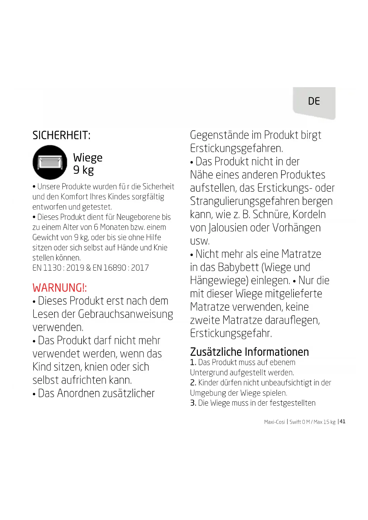 - Nur die mit dieser Wiege mitgelieferte Matratze verwenden, keine zweite Matratze darauflegen, Erstickungsgefahr. Zusätzliche Informationen