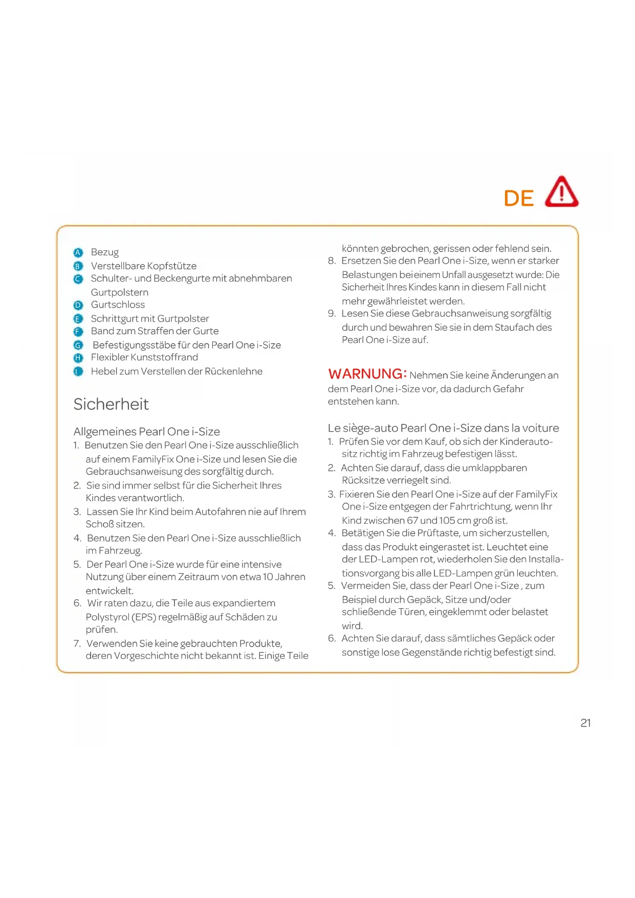 Nehmen Sie keine Änderungen an dem Pearl One i-Size vor, da dadurch Gefahr entstehen kann. Le siège-auto Pearl One i-Size dans la voiture