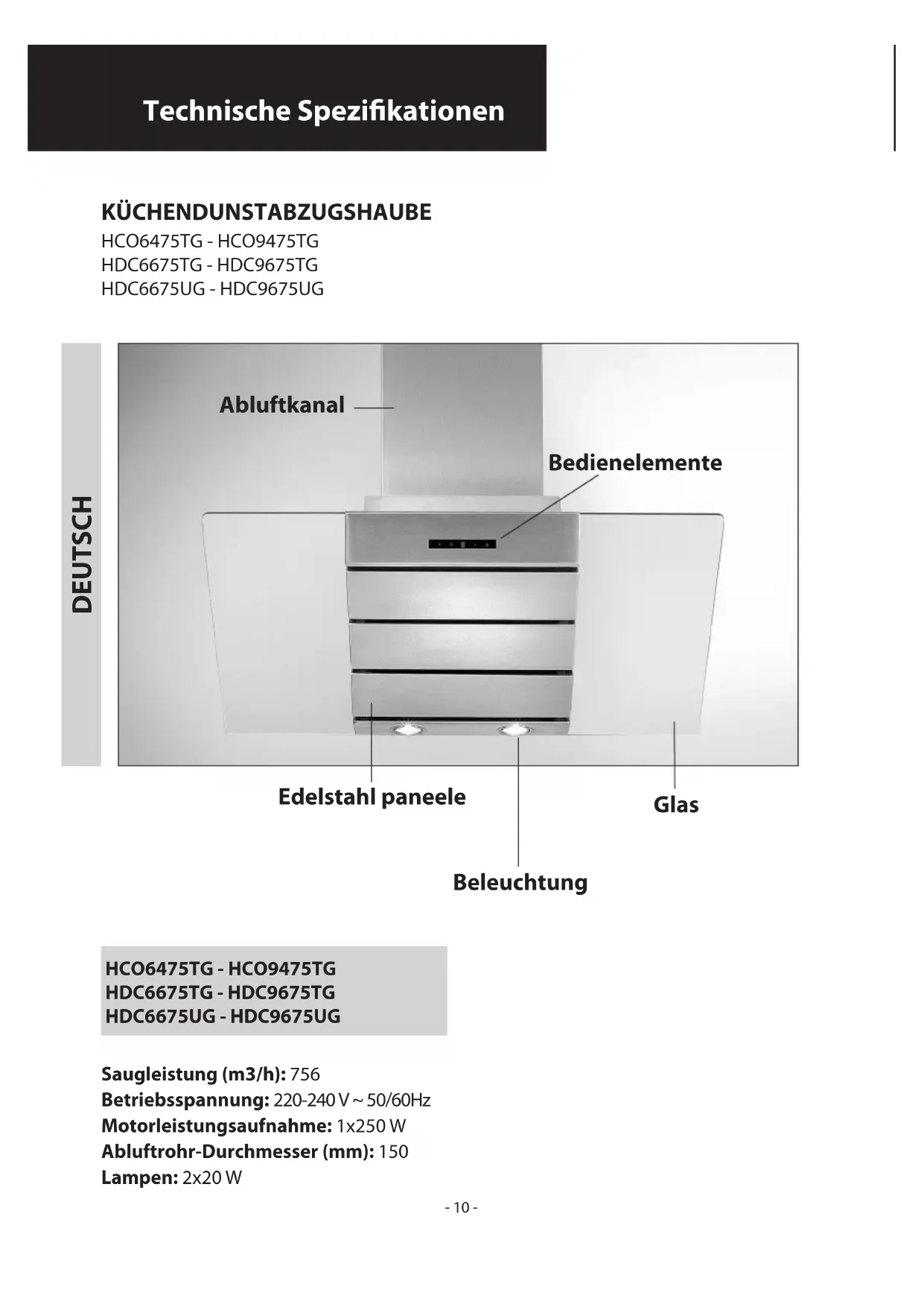 Technische Spezikationen KÜCHENDUNSTABZUGSHAUBE Saugleistung (m3/h): 756 Betriebsspannung: 220-240 V ~ 50/60Hz Motorleistungsaufnahme: 1x250 W Abluftrohr-Durchmesser (mm): 150 Lampen: 2x20 W Bedienelemente Edelstahl paneele Beleuchtung Abluftkanal Glas DEUTSCH- 11 - HDC6475TG HDC9475TG