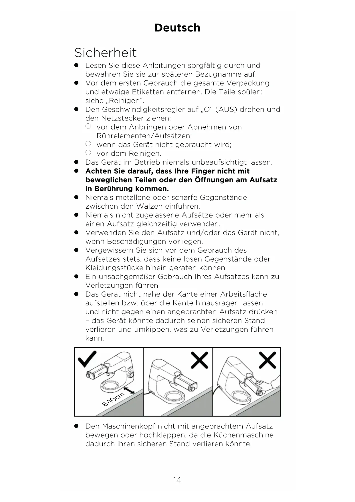 Das Gerät nicht nahe der Kante einer Arbeitsfläche aufstellen bzw. über die Kante hinausragen lassen und nicht gegen einen angebrachten Aufsatz drücken – das Gerät könnte dadurch seinen sicheren Stand verlieren und umkippen, was zu Verletzungen führen kann. 8-10cm