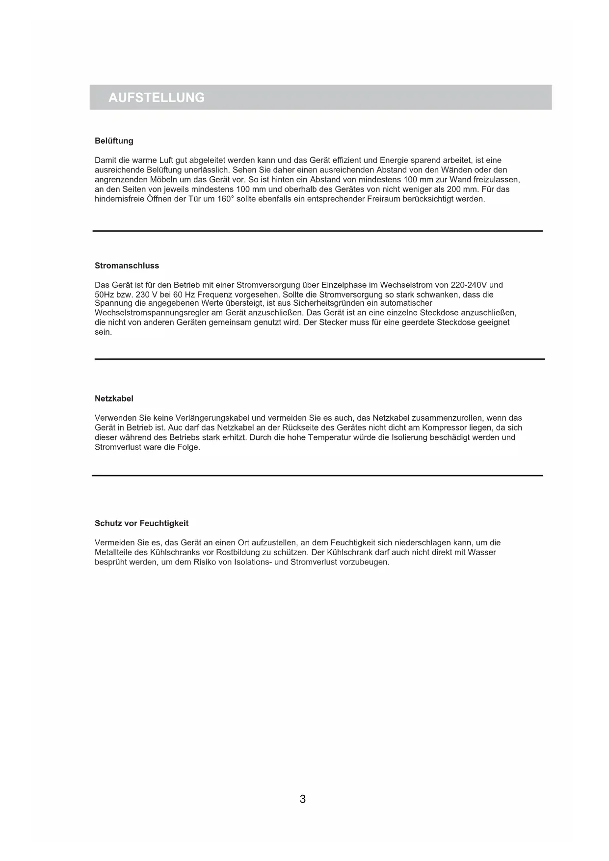 Kinder dürfen keinesfalls mit dem Gerät spielen. Kinder dürfen das Gerät nur unter Beaufsichtigung reinigen und instandhalten 2930Belüftung Damit die warme Luft gut abgeleitet werden kann und das Gerät effizient und Energie sparend arbeitet, ist eine ausreichende Belüftung unerlässlich. Sehen Sie daher einen ausreichenden Abstand von den Wänden oder den angrenzenden Möbeln um das Gerät vor. So ist hinten ein Abstand von mindestens 100 mm zur Wand freizulassen, an den Seiten von jeweils mindestens 100 mm und oberhalb des Gerätes von nicht weniger als 200 mm. Für das hindernisfreie Öffnen der Tür um 160° sollte ebenfalls ein entsprechender Freiraum berücksichtigt werden. Stromanschluss Das Gerät ist für den Betrieb mit einer Stromversorgung über Einzelphase im Wechselstrom von 220-240V und 50Hz bzw. 230 V bei 60 Hz Frequenz vorgesehen. Sollte die Stromversorgung so stark schwanken, dass die Spannung die angegebenen Werte übersteigt, ist aus Sicherheitsgründen ein automatischer Wechselstromspannungsregler am Gerät anzuschließen. Das Gerät ist an eine einzelne Steckdose anzuschließen, die nicht von anderen Geräten gemeinsam genutzt wird. Der Stecker muss für eine geerdete Steckdose geeignet sein. Netzkabel Verwenden Sie keine Verlängerungskabel und vermeiden Sie es auch, das Netzkabel zusammenzurollen, wenn das Gerät in Betrieb ist. Auc darf das Netzkabel an der Rückseite des Gerätes nicht dicht am Kompressor liegen, da sich dieser während des Betriebs stark erhitzt. Durch die hohe Temperatur würde die Isolierung beschädigt werden und Stromverlust ware die Folge. Schutz vor Feuchtigkeit Vermeiden Sie es, das Gerät an einen Ort aufzustellen, an dem Feuchtigkeit sich niederschlagen kann, um die Metallteile des Kühlschranks vor Rostbildung zu schützen. Der Kühlschrank darf auch nicht direkt mit Wasser besprüht werden, um dem Risiko von Isolations- und Stromverlust vorzubeugen. AUFSTELLUNG 31Schutz vor Wärme Halten Sie das Gerät fern von Wärmequellen und von direkter Sonneneinstrahlung. Waagerechte Ausrichtung Stellen Sie das Gerät auf einen ebenen und stabilen Boden. Der Boden darf nicht mit weichem Material wie Schaumgummi o.Ä. ausgelegt sein. Richten Sie das Gerät über die entsprechenden Schrauben waagerecht aus, falls es nicht eben steht. Stellen Sie das Gerät nicht in die Nähe von Gegenständen, die Resonanzgeräusche produzieren könnten. Fernhalten von Gefahrenquellen Es ist dringend davon abzuraten, den Kühlschrank in die Nähe von brennbaren oder leicht entzündlichen Stoffen wie Gas, Benzin, Alkohol, Lack oder Öl usw. aufzustellen. Diese Stoffe dürfen auch nicht im Kühlschrank aufbewahrt werden. Transport Beim Transport oder an seiner endgültigen Stelle darf das Gerät weder waagerecht hingelegt noch mit mehr als 45° Neigungswinkel gekippt, noch auf den Kopf gestellt werden. 32x Das Wasser, das in den Lebensmitteln enthalten ist, oder die Luftfeuchtigkeit, die durch Öffnen der Tür in das Gerät gelangt, können im Gefrierschrank zu einer Frostschicht gefrieren, welche die Kühlung beeinträchtigen kann. Tauen Sie den Gefrierschrank ab, wenn diese Frostschicht dicker als 2 mm ist. x Das Abtauen erfolgt im Gefrierbereich manuell. Vor dem Abtauen entnehmen Sie das Gefriergut, den Eiswürfelbehälter und die Ablage aus der Gefrierzelle. Stellen Sie dann den Temperaturknopf vorübergehend auf „0“, so dass der Kompressor aufhört zu arbeiten, und lassen Sie die Tür offen, bis die Frostschicht vollständig aufgetaut ist. Wischen Sie das Wasser ab und trocknen Sie sorgfältig mit einem weichen Tuch. Um das Abtauen zu beschleunigen, können Sie einen Behälter mit warmem Wasser (ca. 50°C) in die Gefrierzelle stellen. Nach dem Abtauen stellen Sie sicher, dass der Temperaturknopf wieder auf die ursprüngliche Position gestellt wird. x Es ist dringend davon abzuraten, die Gefrierzelle direkt mit heißem Wasser zu begießen oder mit einem Haartrockner aufzuheizen, da sonst das Innengehäuse dadurch deformiert werden könnte. x Benutzen Sie niemals scharfe Gegenstände wie Messer, Schaber o. Ä., um die Eisfläche oder die Frostschicht abzukratzen oder die am Gefrierschrankboden haftenden Behältnisse mit Gefriergut zu trennen. Das könnte das Innengehäuse oder gar die Oberfläche des Verdampfers unwiederbringlich beschädigen. x Sollte das Netzkabel des Gerätes beschädigt werden, ist dieses durch einen gleichen Typs zu ersetzen. Die Arbeiten dürfen nur von einem autorisierten Werkskundendienst durchgeführt werden, da hierfür spezielles Werkzeug notwendig ist. Lampenwechsel Zum Auswechseln der Lampe, gehen Sie wie folgt vor: - Ziehen Sie das Netzkabel von der Steckdose ab - Entfernen Sie die Lampenabdeckung durch Zusammendrücken der beiden Laschen an deren Seiten - Ersetzen Sie die Lampe mit einer neuen mit maximaler Wattzahl entsprechend den Angaben auf dem Matrikelschild des Gerätes - Montieren Sie die Lampenabdeckung wieder und warten Sie 5 Minuten, bevor Sie das Gerät erneut ans Stromnetz anschließen VORSICHTSMAßNAHMEN